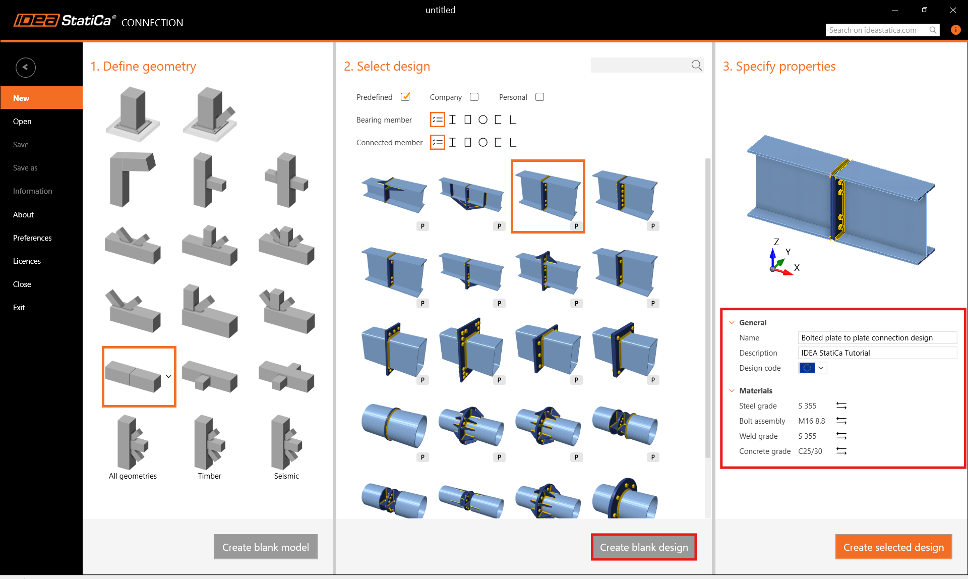 Create a new project by selecting the desired geometry. Fill in the name and choose Eurocode as the design code and the steel grade as S355. Then create blank design.