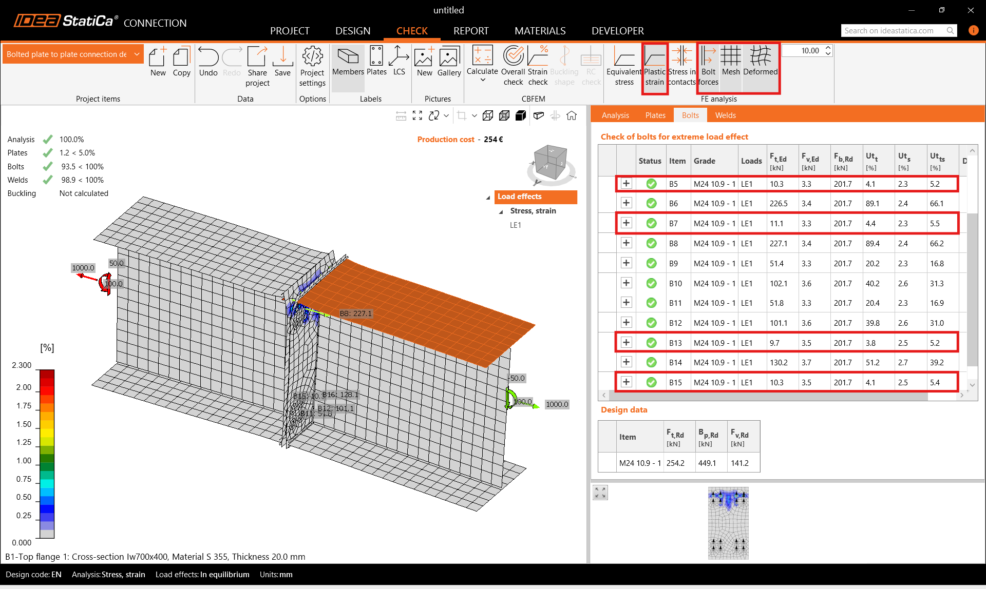 More detailed results can be displayed in the Check tab. Activate the Plastic strain, Bolt forces, Mesh, and Deformed shape in the ribbon to get a full picture of what is happening in the model.