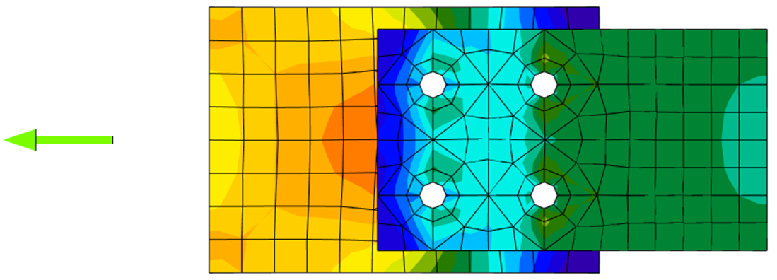 Only the compression force is transferred from the bolt shank to the plate in the bolt hole. It is modeled by interpolation links between the shank nodes and holes edge nodes. The deformation stiffness of the shell element modeling the plates distributes the forces between the bolts and simulates the adequate bearing of the plate.