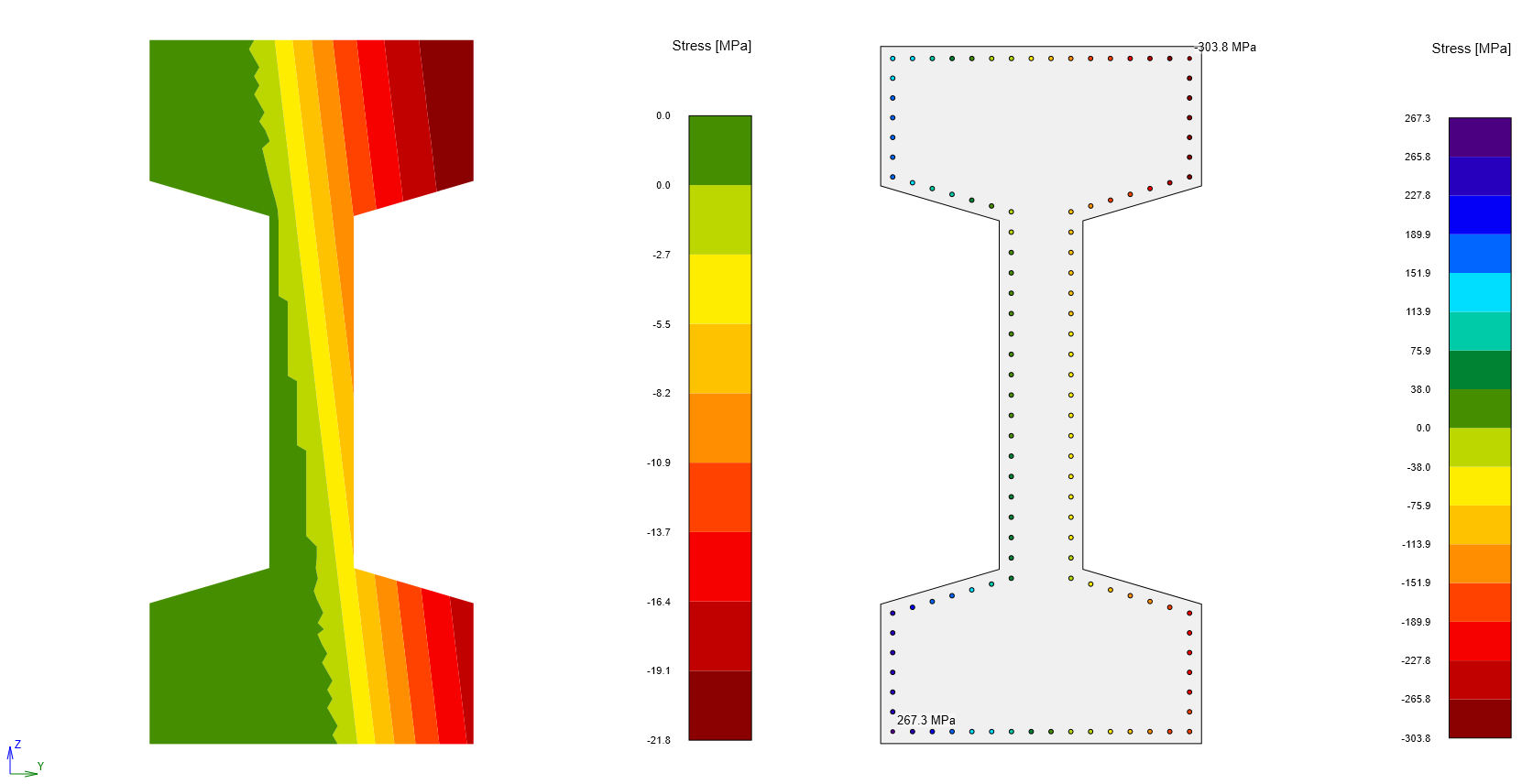 Once the calculation is completed. You can check the results. First, have the program displayed the bending moment Mz diagram. Then you can click on Detailed and Stress. Don't forget to choose the critical section. You will see the stress in the concrete.