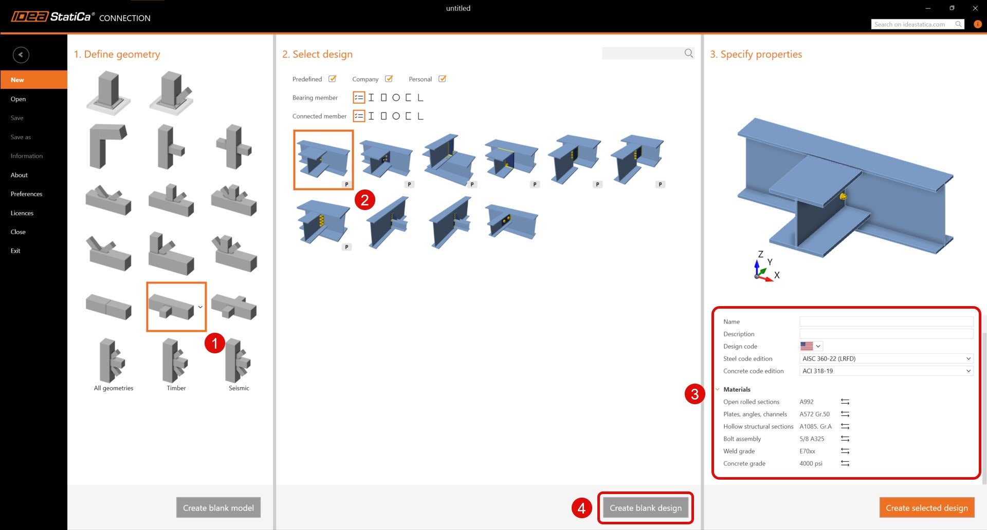 Let’s launch the IDEA StatiCa Connection application (download the newest version). Create a new project by selecting a template closest to the required design and fill the name and the description of the project. After choosing the required properties, confirm by Create project.