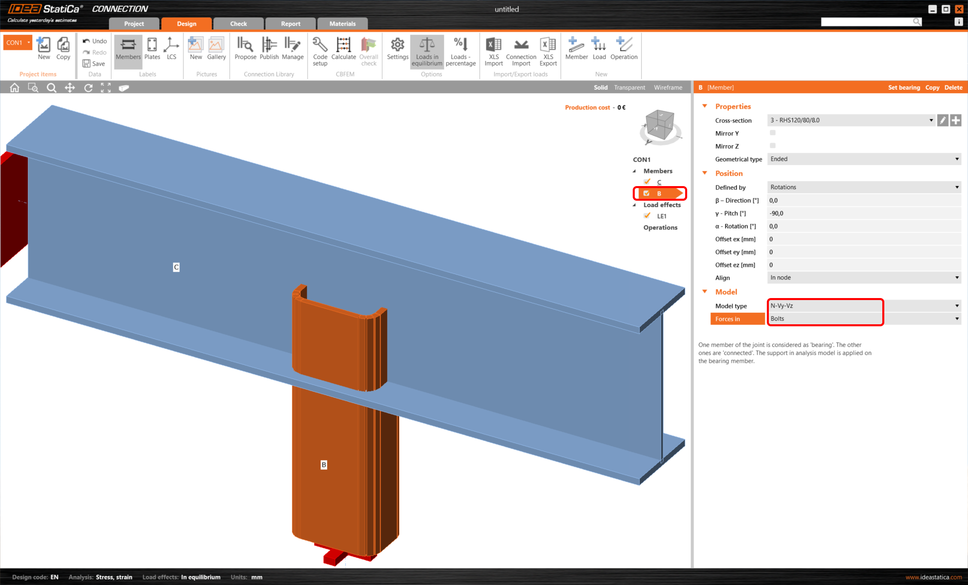 Now, you can modify the properties of member B. Set the Model type to N-Vy-Vz and the parameter Forces in to Bolts.