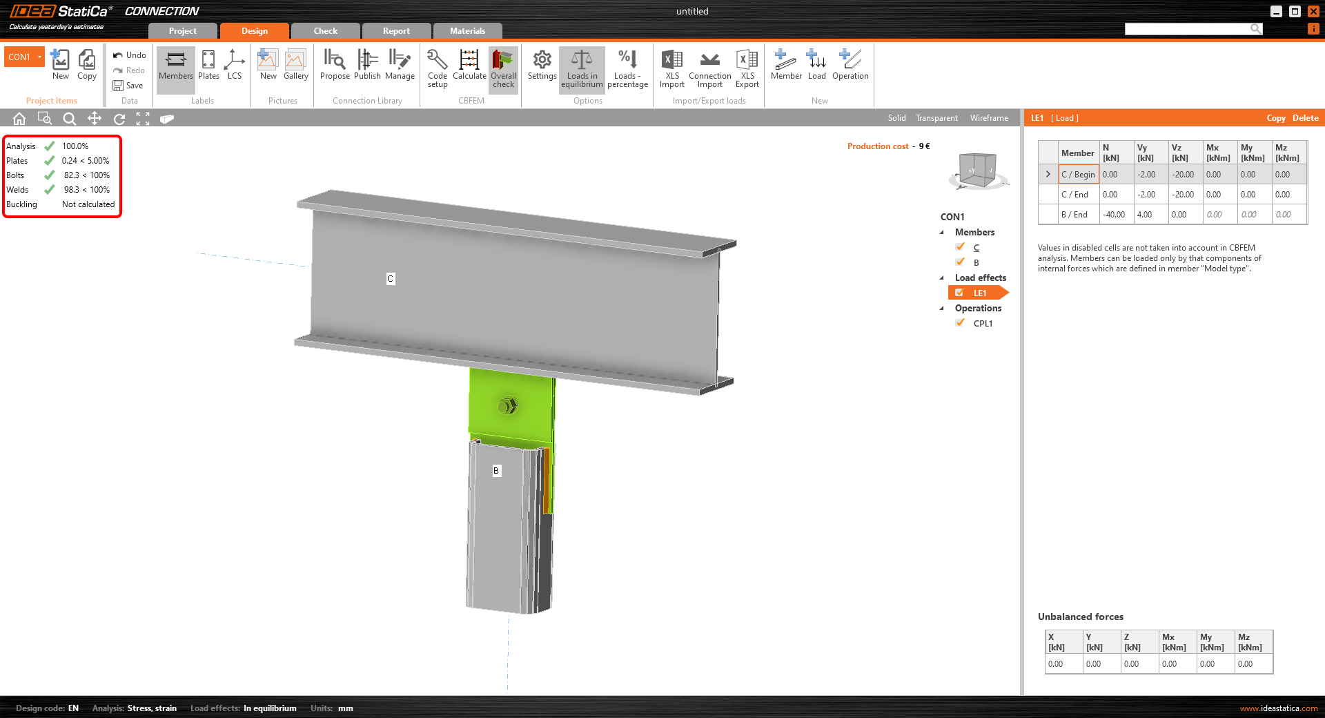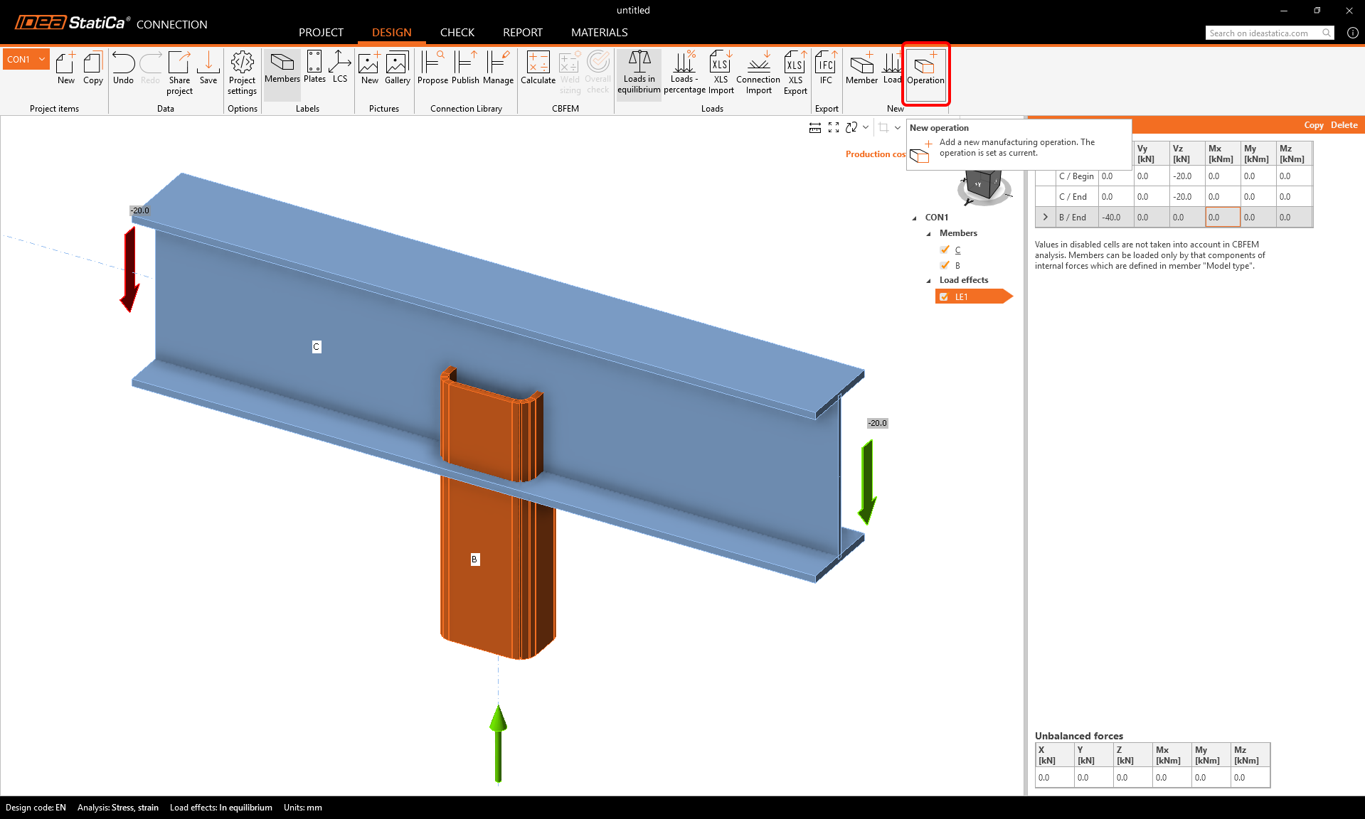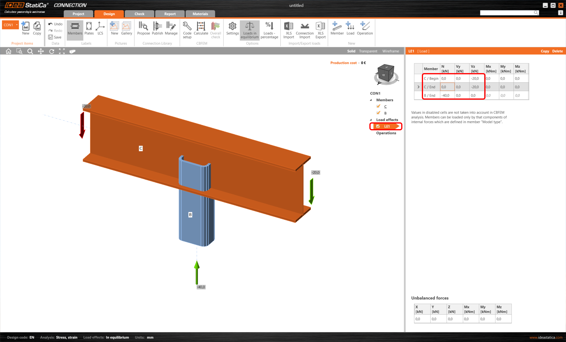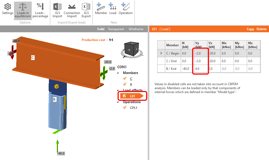 Let’s continue with the Load effects. Load effect LE1 was automatically added. Input -40 kN of normal force N [kN] for member B / End in the tab and -20 kN of shear force Vz [kN] for both ends of member C (C / Begin, C / End).