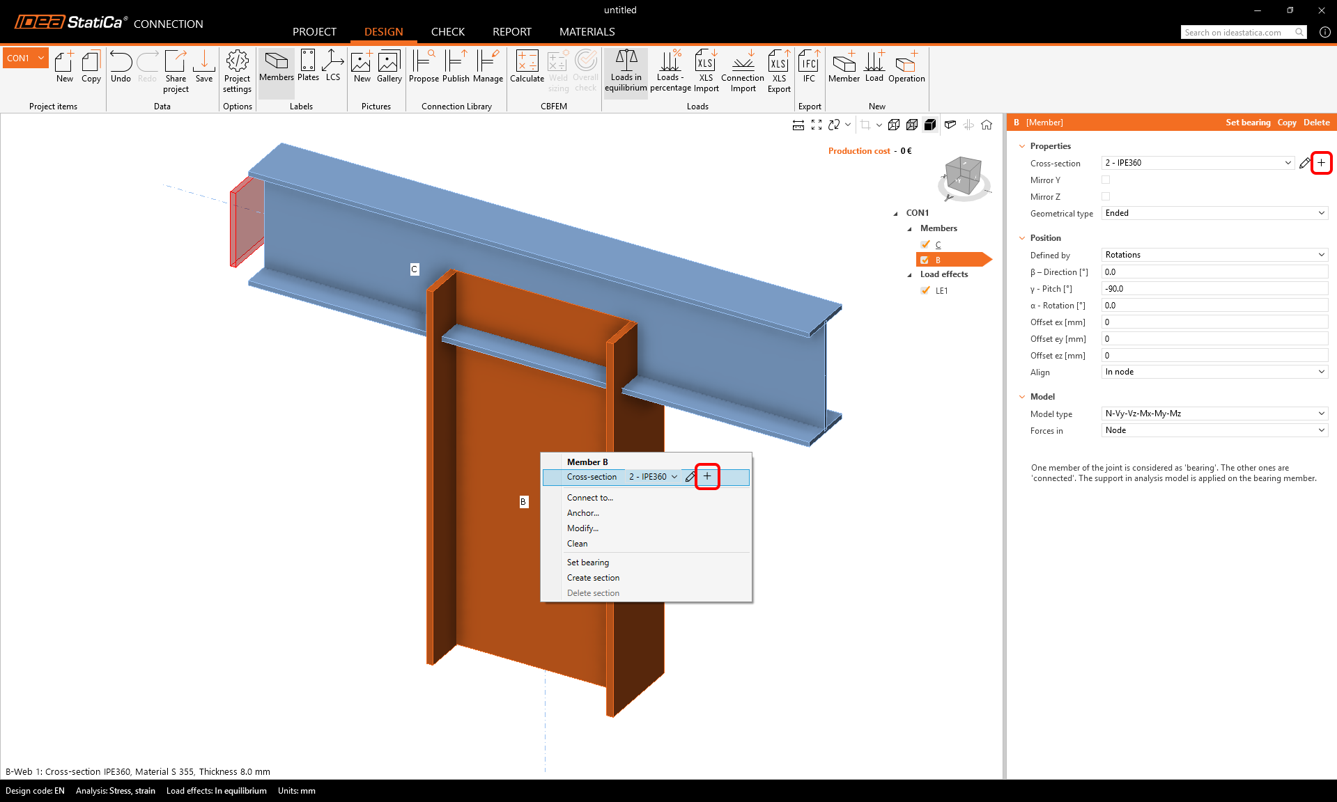 Now, change the cross-section of the vertical member B to another shape, again using the right-mouse button on the member in the scene or the plus button in properties.