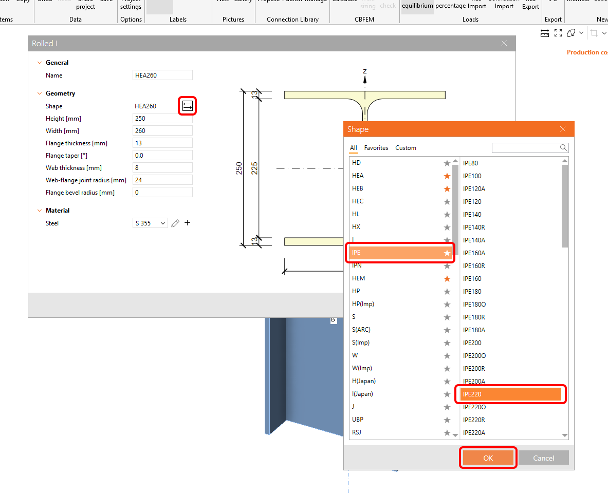 Select IPE220 from the library.