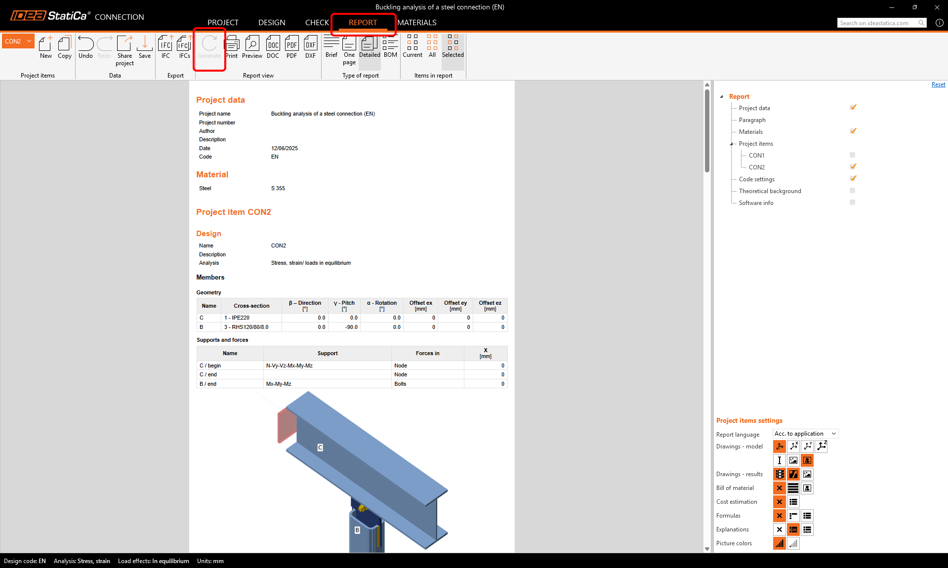 As the last step, go to the tab Report and Generate it. IDEA StatiCa offers a fully customizable report to print out or save in an editable format.