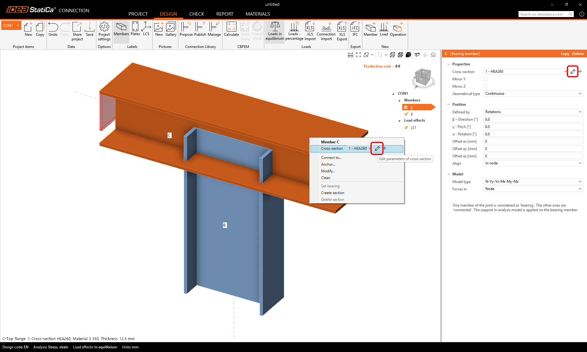 Start with the modification of the cross-section of the horizontal member C. Use the right-mouse-click on the member in the scene or the pen button in properties to change the cross-section of the same shape.