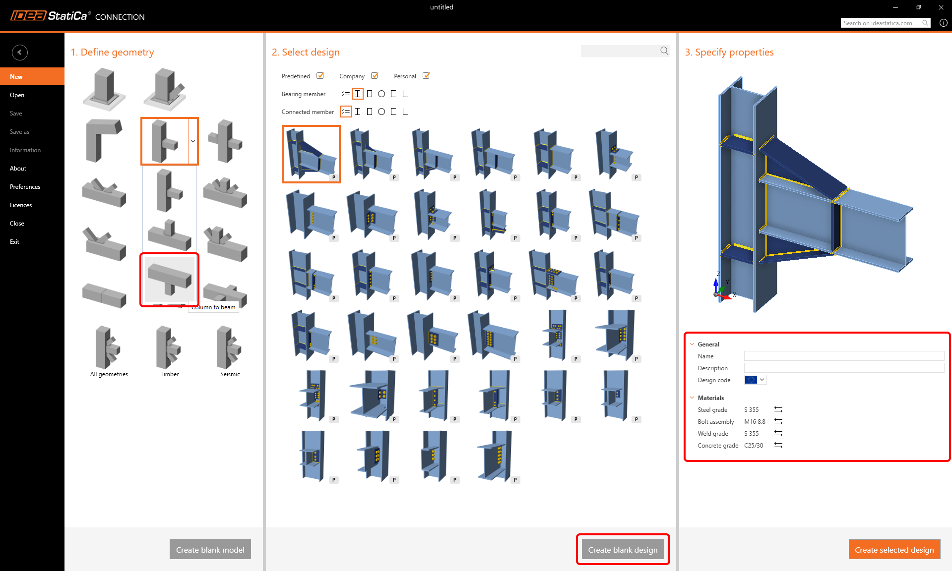 Create a new project by selecting the starting template closest to the desired design. Fill in the name, select the steel grade S355, design code Eurocode, and Create project.