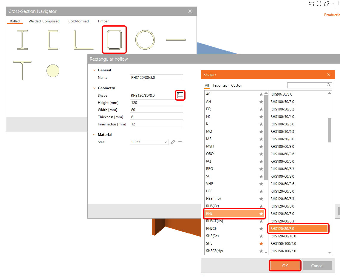 Choose the rectangular hollow sections group and confirm the RHS120/80/8.0 type of cross-section.