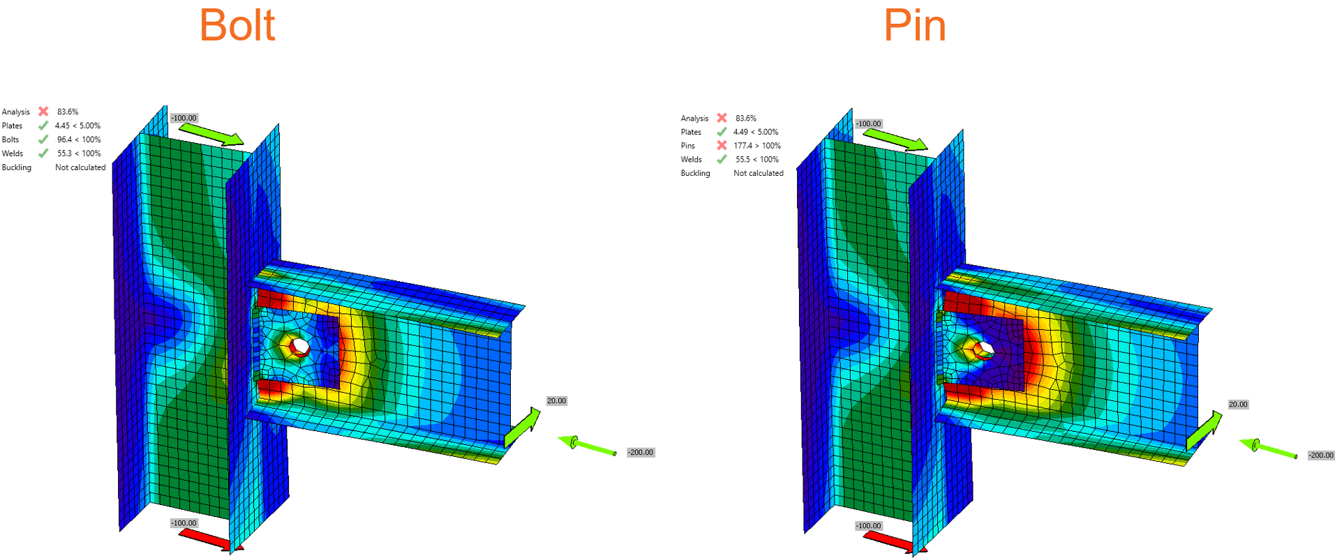 Also note that the bolted gusset plate connections provide reasonable buckling factors while connections with pins provide extremely low buckling factors. This is due to the analysis model of pin that consists of many special elements (rigid body elements, beam elements, gap elements...) and provides good results in terms of resistances of pin in shear, bending and bearing. Therefore a simple procedure is described below.