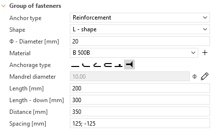 • L-shape: Defined as two rows of anchors with adjustable spacing and row distance, with the option to specify anchorage type.