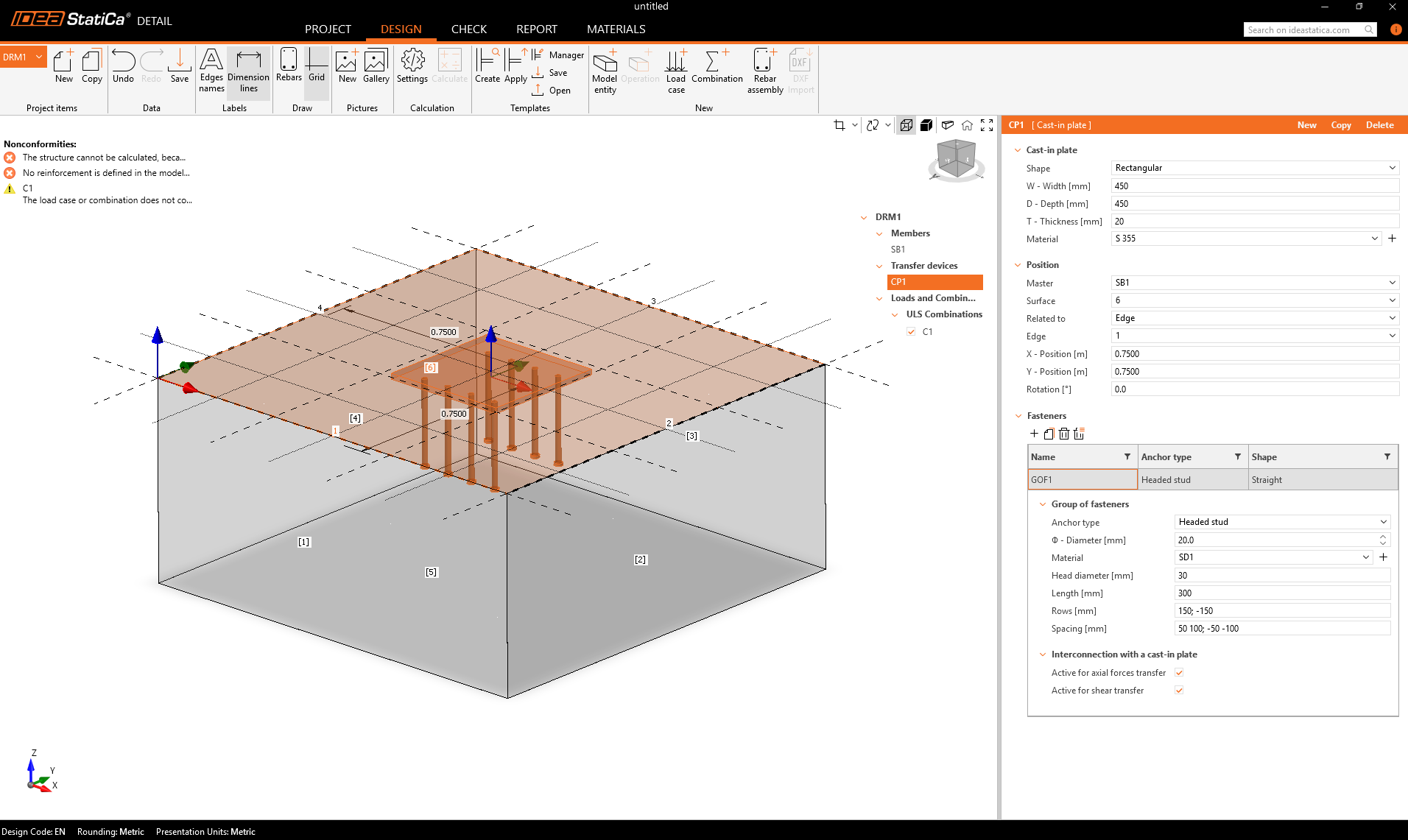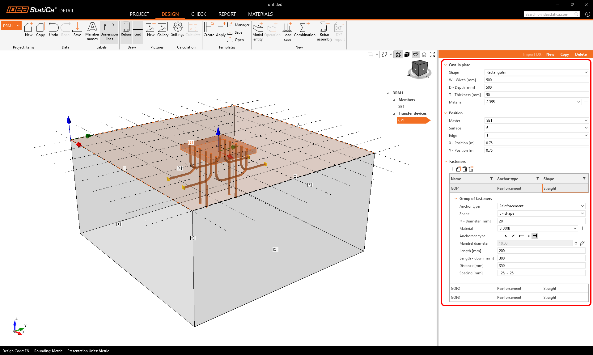 Cast-in plates are available as a Load Transfer Device in the model entity selection. The plate’s geometry and position can be defined in a single property grid, while an additional table allows users to add and combine multiple groups of fasteners. Fasteners can be defined directly for each specific plate. Users are able to add an unlimited number of fasteners and even combine multiple types within a single plate.