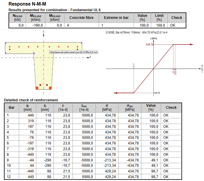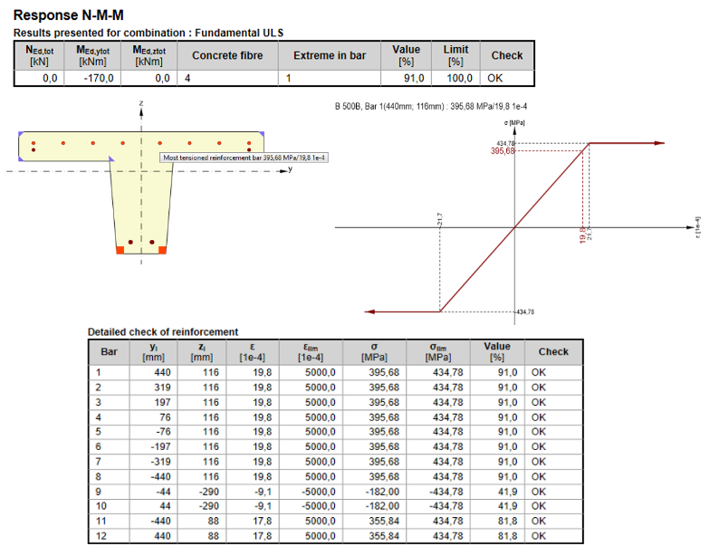 The response for bending moment 170 kNm - all bars below the yield stress