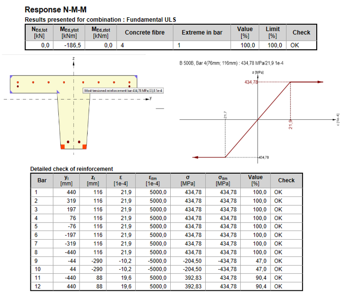 The response for bending moment 186,5kNm - some bars start to yield