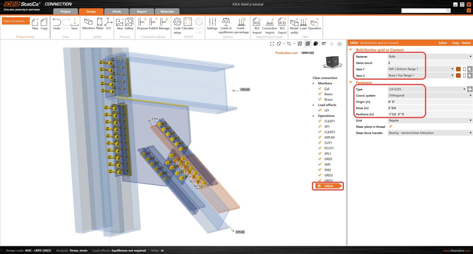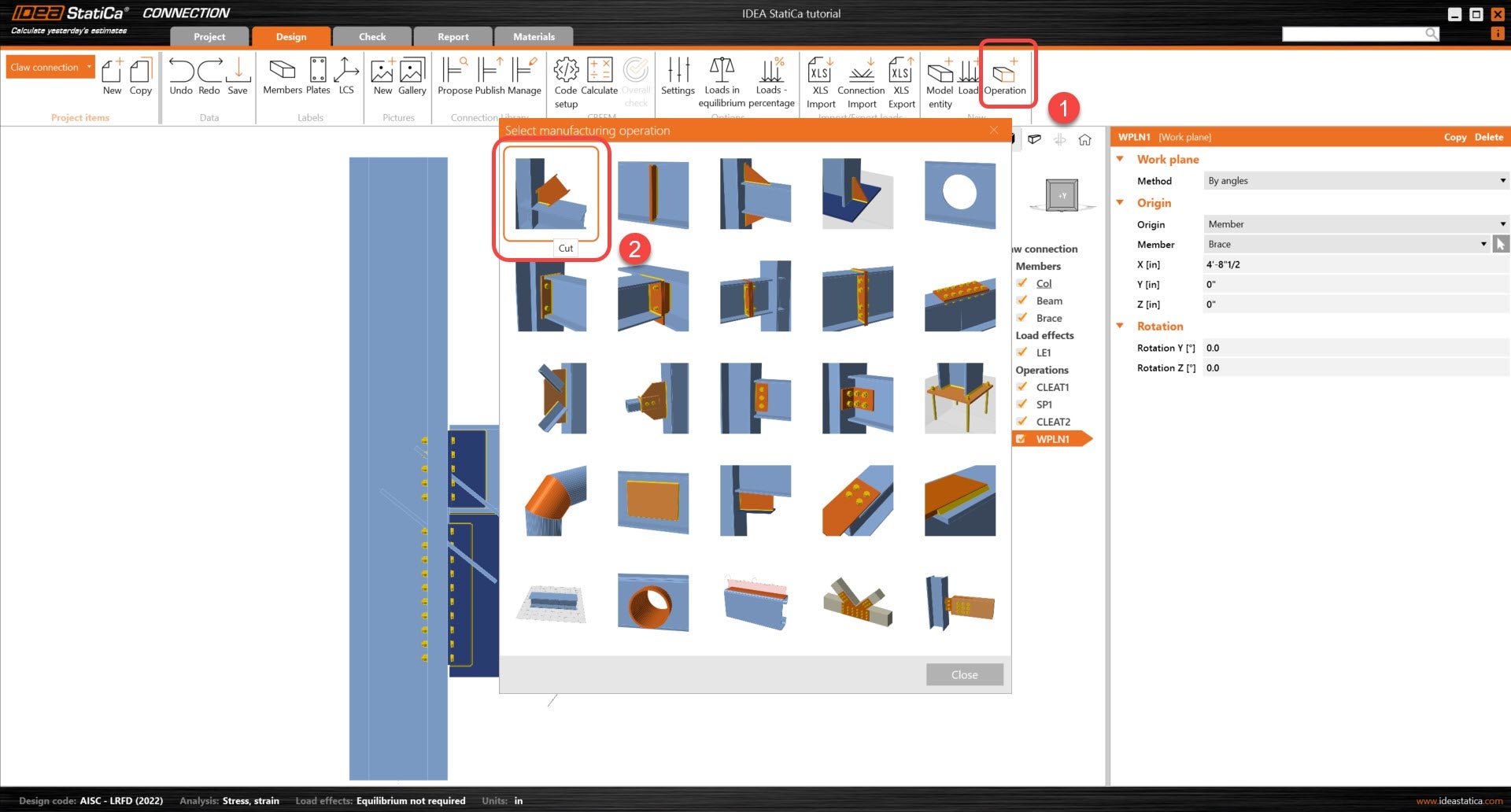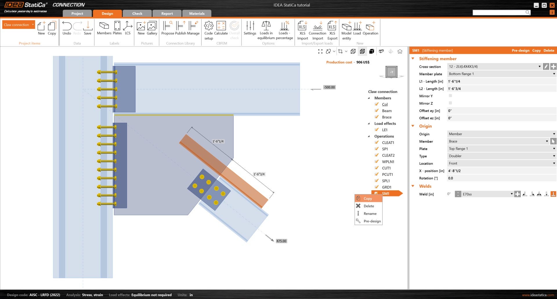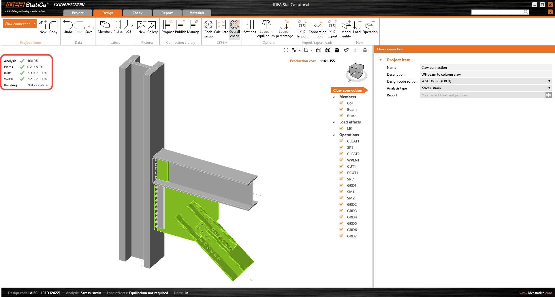 Learn how to use IDEA StatiCa Connection to design and code-check a structural steel joint, an example is a Claw angle on WF bracing connection. The tutorial will demonstrate how to create a connection that is not predefined in the manufacturing operations.