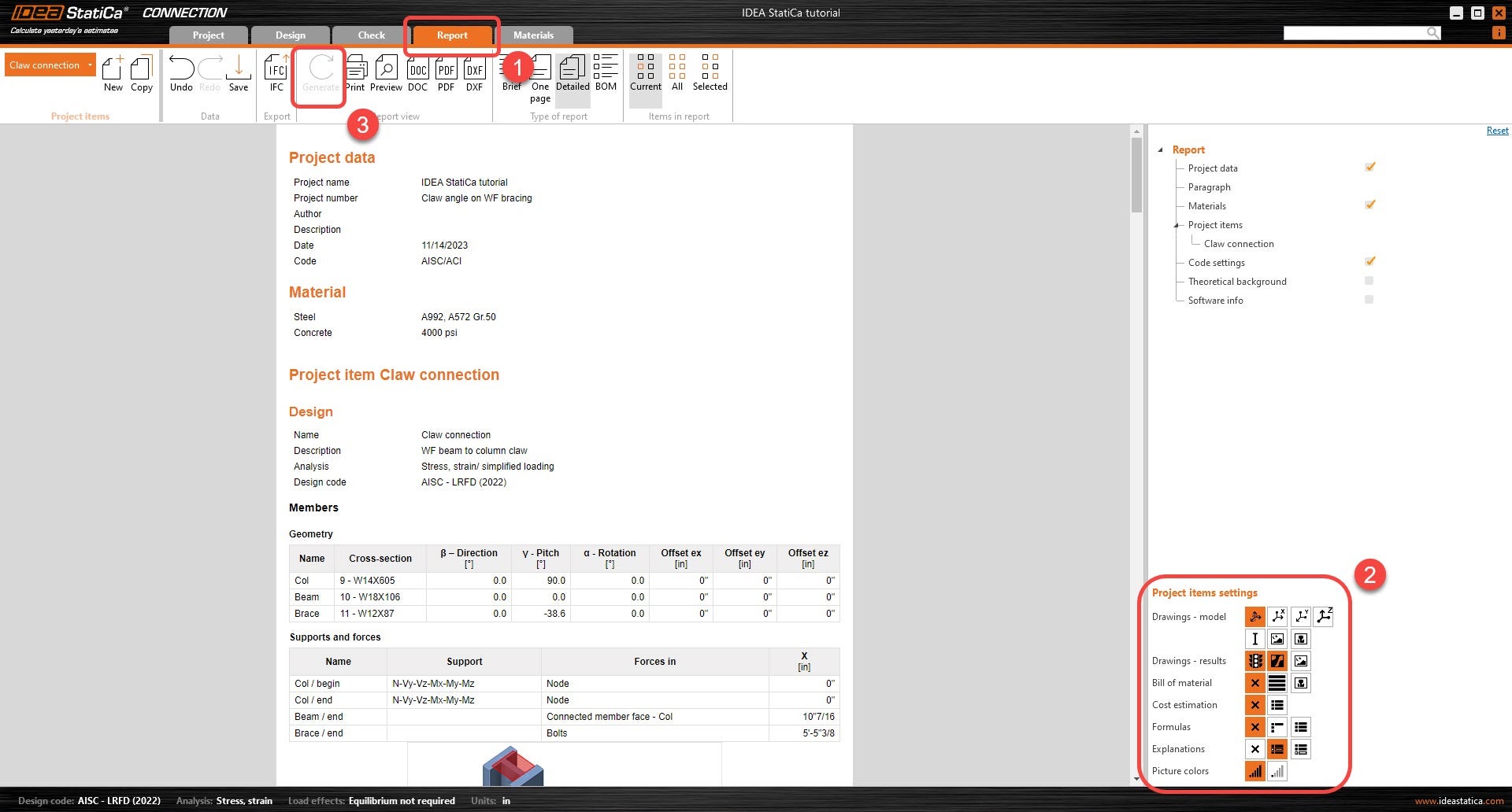 At last, go to the tab Report. IDEA StatiCa offers a fully customizable report where you can add or remove as much detail as needed. Once done, click Generate and the report will be generated with the parameters it was given.