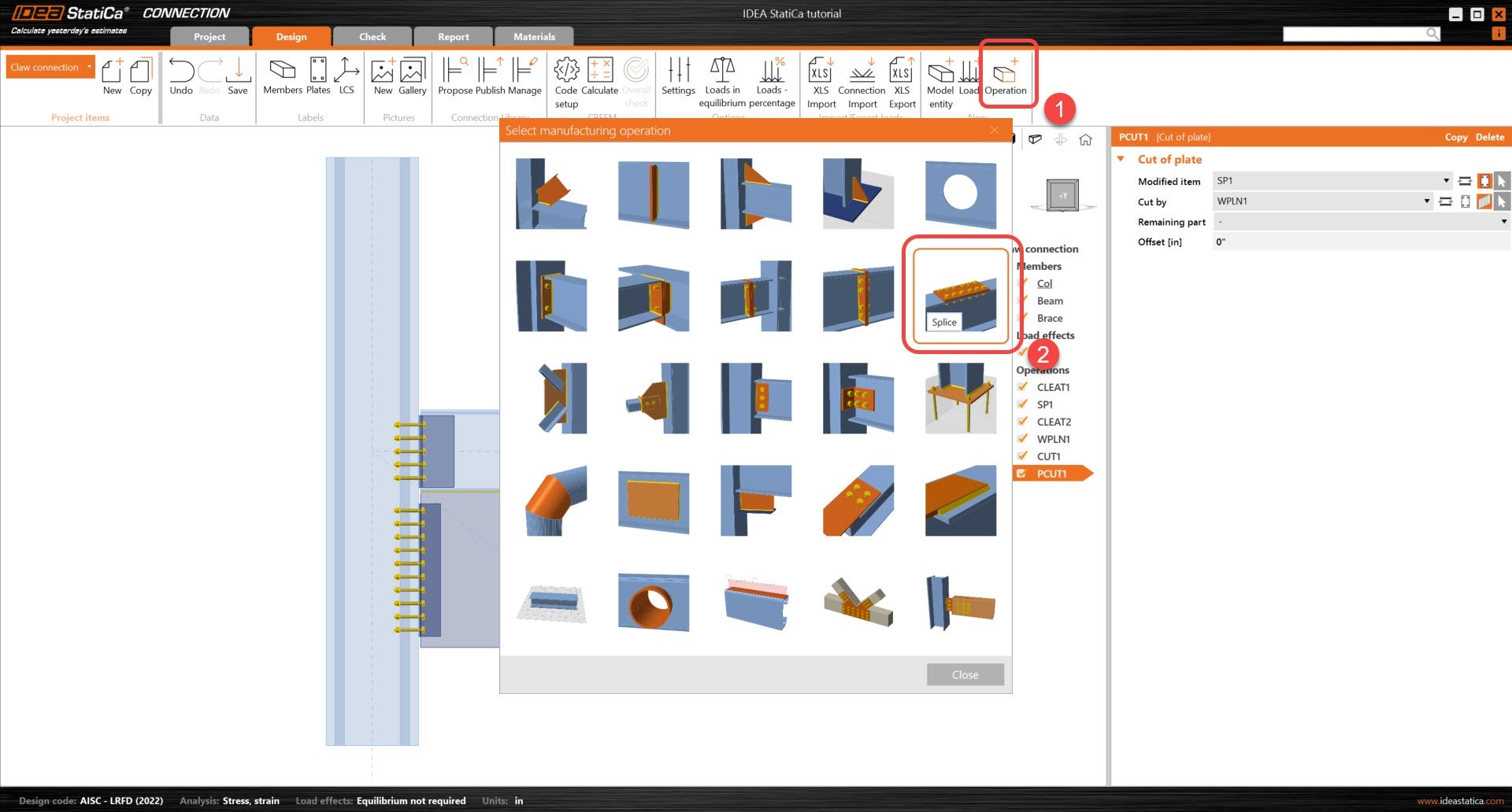 Now, we will focus on the claw connection. To start, lets add a Splice operation to connect the Brace Web to the stiffening plate, SP1.  The Splice operation allows for the editing of the plate and bolt placement onto the Brace member. In the bolts section and in other bolt operations, the bolt position can be defined in three different ways.