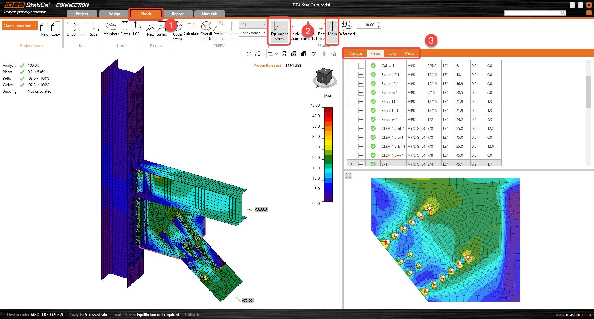Go to the Check tab and activate Equivalent stress and Mesh from the ribbon to observe the stress flow in the connection. The different results for all components (Plates, bolts & welds) are displayed on the right.