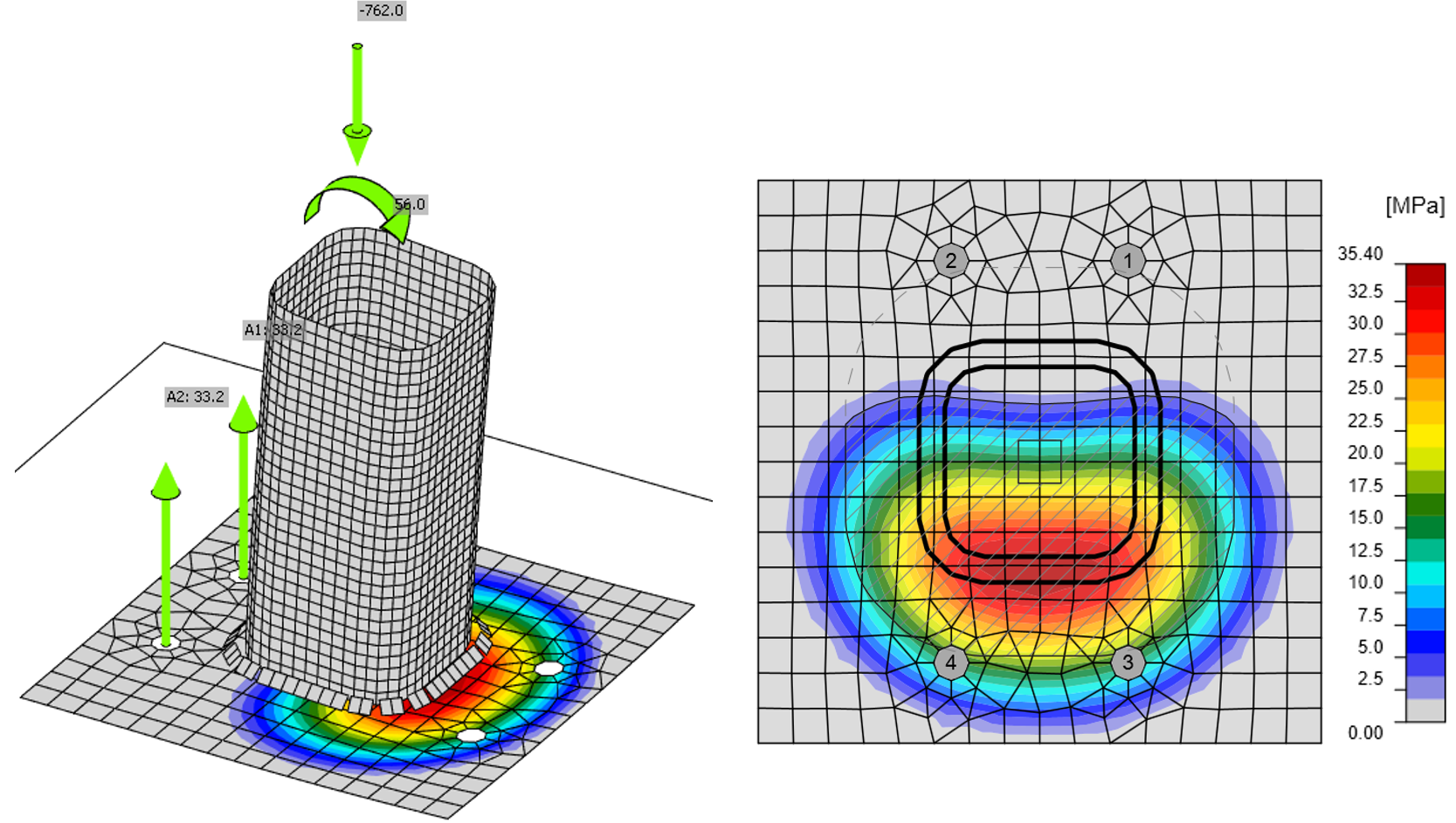 In CBFEM, the prying forces occur in the case of loading in pure tension loading; while in CM, no prying forces are developed by limiting the resistance to 1-2 failure mode only; see (Wald et al. 2008). Due to the prying forces, the difference in resistance is about 10 %. The numerical model of the column base is shown in Fig. 8.4.2. Results by CBFEM are presented by the bearing stress distribution on concrete for points 0 and 3, displayed in Fig. 8.4.3 and Fig. 8.4.4, and compared on the interaction diagram in Fig. 8.4.5.