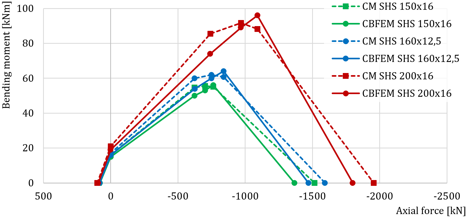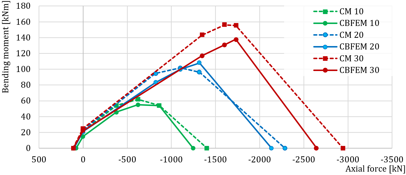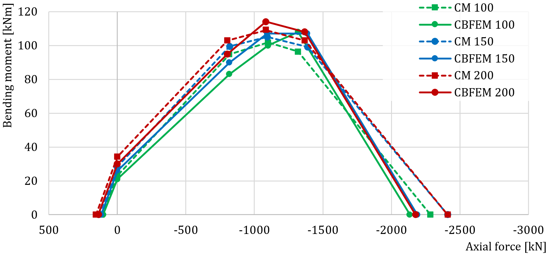 For the sensitivity study of column cross-section, the concrete grade C20/25, the base plate thickness 20 mm, the base plate offset 100 mm, and the concrete block offset 200 mm were used for varying parameters of the column section. The comparison of CBFEM to the analytical model by CM is shown in the interaction diagrams in Fig. 8.4.6.