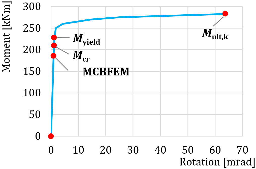 The global behavior of a beam-to-column joint with a slender column web stiffener of thickness 3 mm described by moment-rotation diagram in CBFEM model is shown in Fig. 6.3.2. Attention is focused on the main characteristics: design resistance and critical load. The diagram is completed with a point where yielding starts and resistance by 5 % plastic strain.