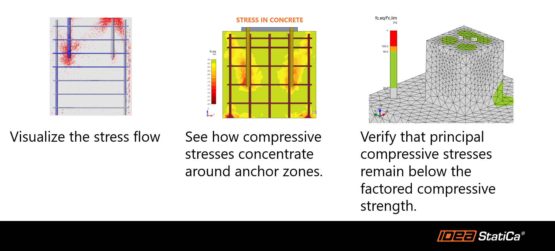 Therefore, in case the concrete cone fails, it is appropriate to proceed to IDEA StatiCa Detail, where an analysis of the entire reinforced block is provided. The tensile strength of the concrete is conservatively neglected, which means the bearing capacity for cone failure is, to a considerable extent, determined by the specified amount of reinforcement. Detail compares the maximum equivalent principal stresses against factored concrete strengths, providing a detailed and accurate verification of concrete breakout resistance under complex loading scenarios.