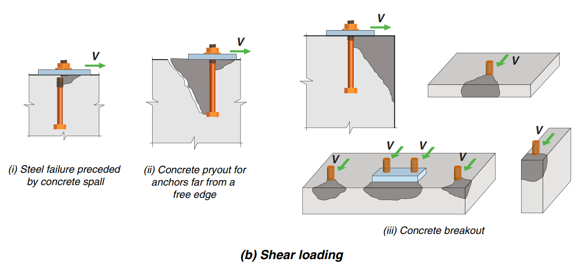 ACI classifies shear-induced failures into several types for anchors and concrete blocks, including steel failure with concrete spalling, concrete pryout and concrete breakout (i, ii & iii).