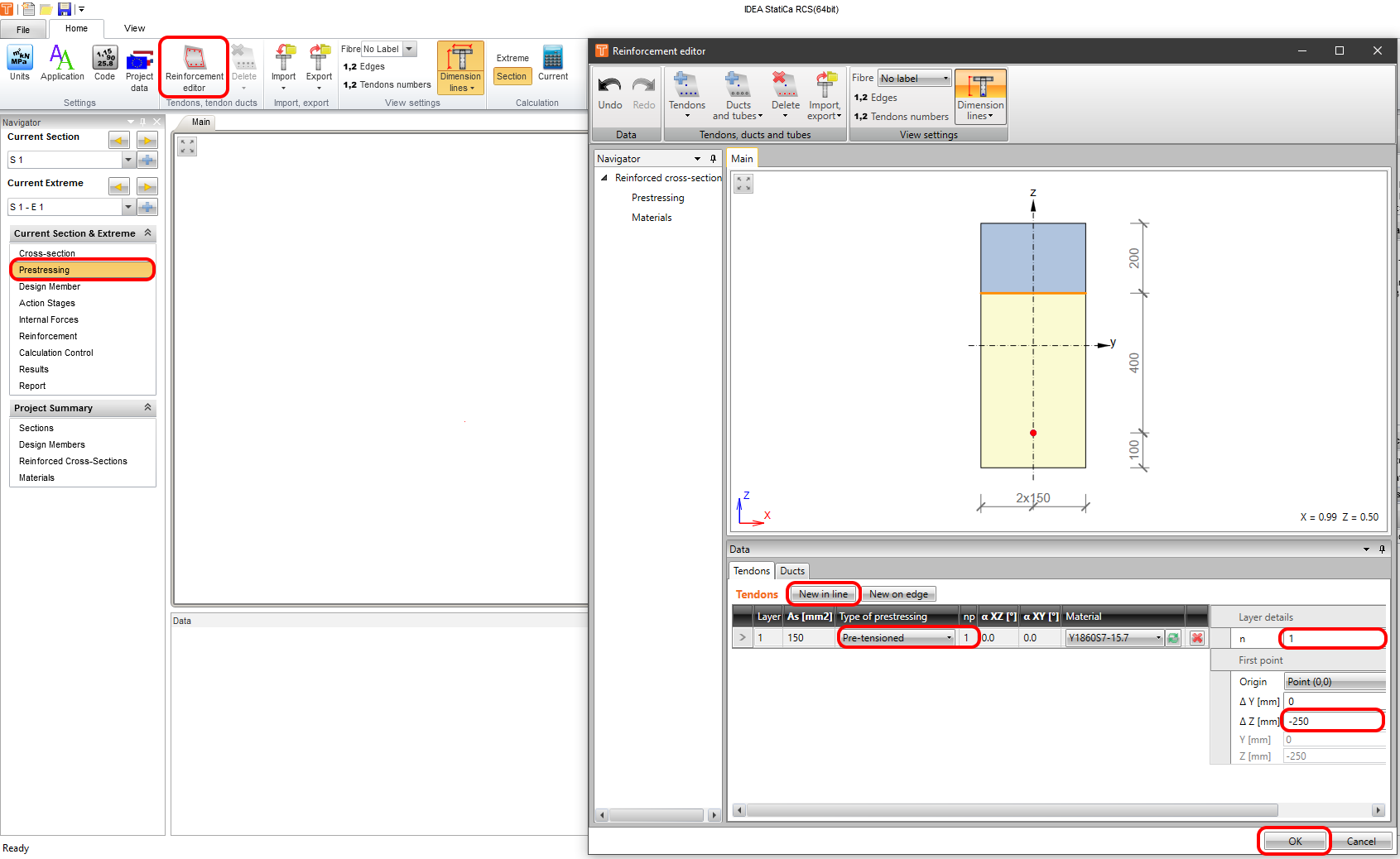 The prestressing arrangement accommodates both Pre and Post-tensioned tendons. Place a Pre-tensioned tendon at a distance of 250 mm from the center of gravity across the entire section.