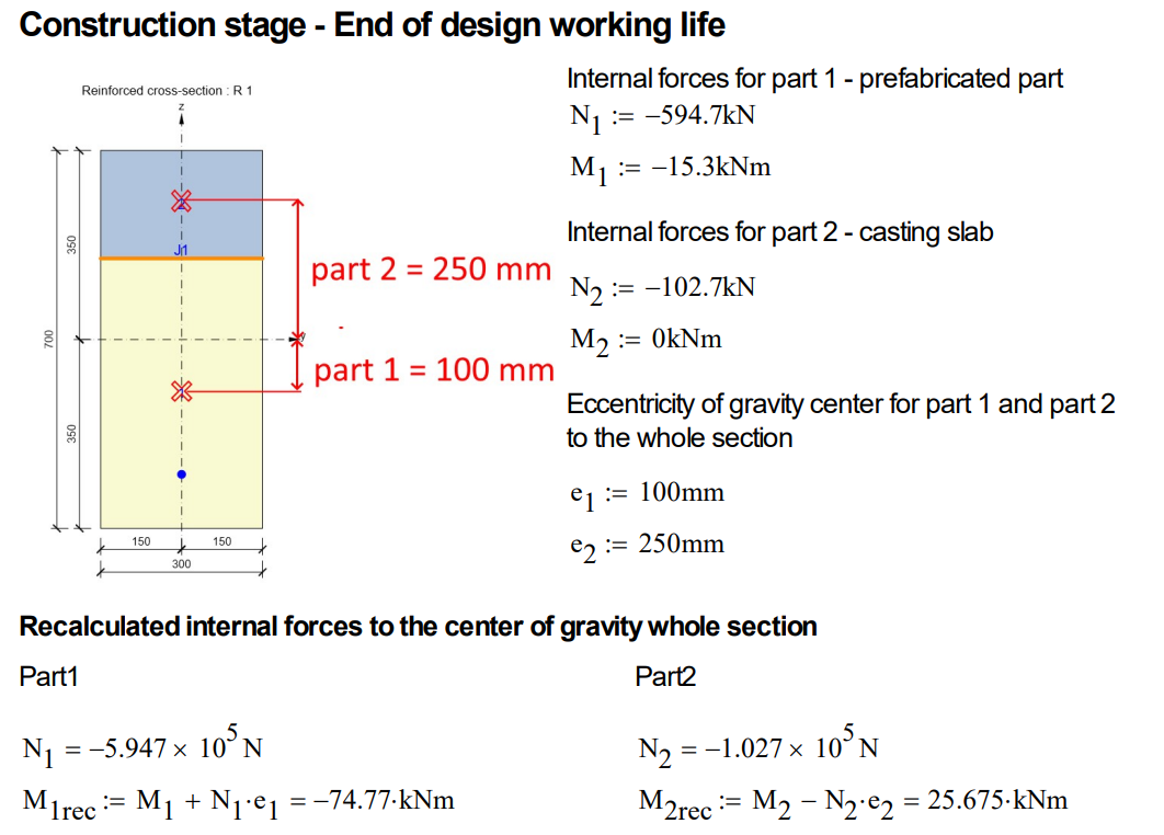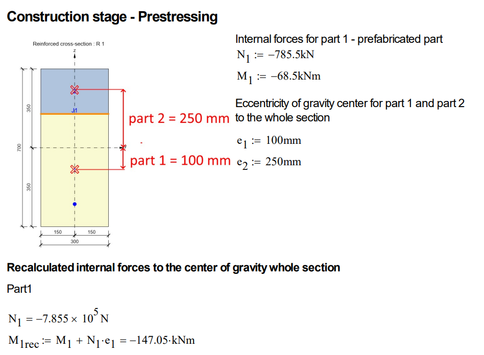 The internal forces pertain to each component and necessitate recalculation to the center of gravity of the entire concrete section. Here is in detail described the workflow for all stages: