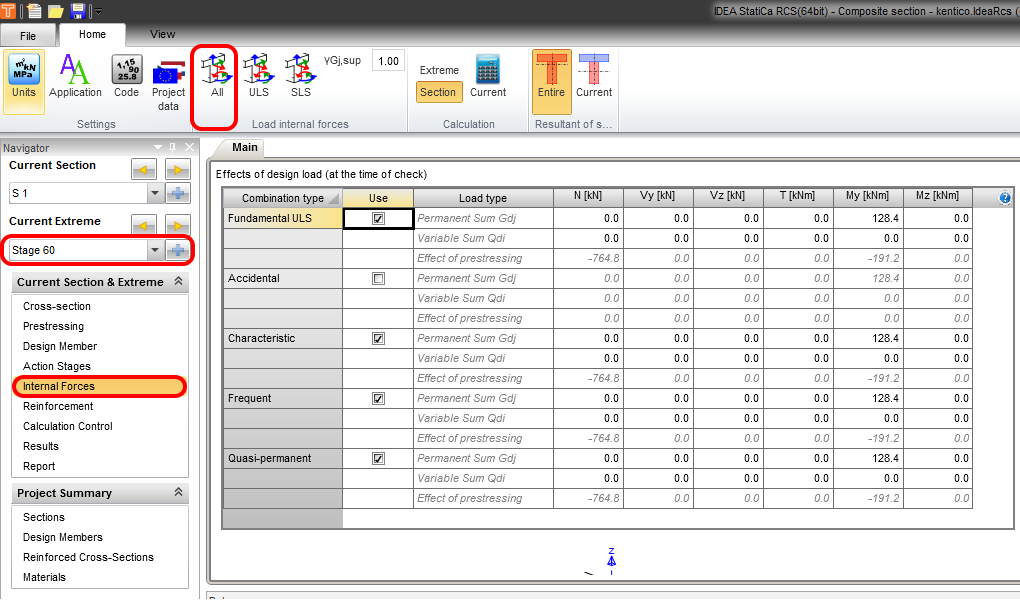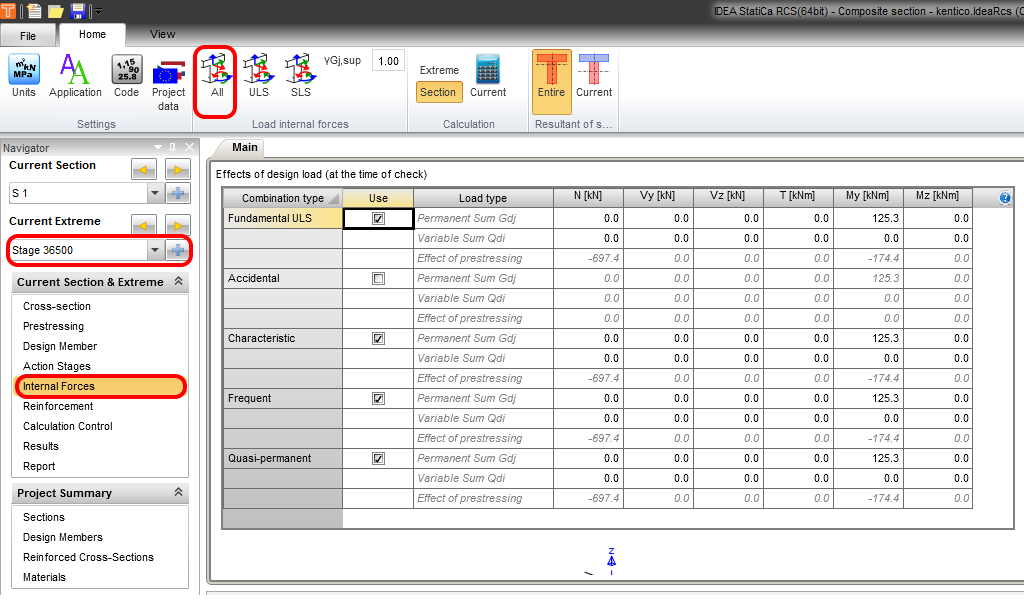 The internal forces won't be rewritten again but will be extracted from the Action Stages tab.  At first, set the Current Extreme(1), which represents the construction stage. In general, a partial factor of 1.35 is considered for ULS and permanent loads, which is also the default setting in IDEA StatiCa RCS. For our purpose, we choose a factor with a value of 1(2). We will use the All button to extract the internal forces from the Action Stages.