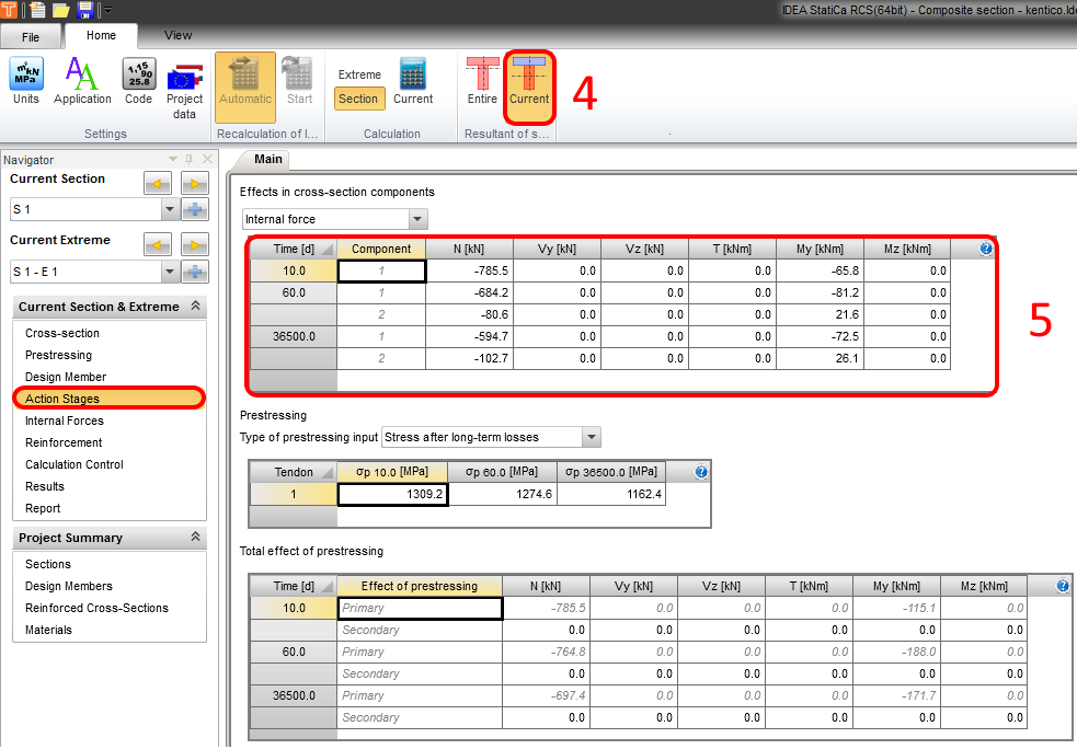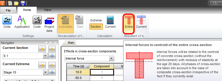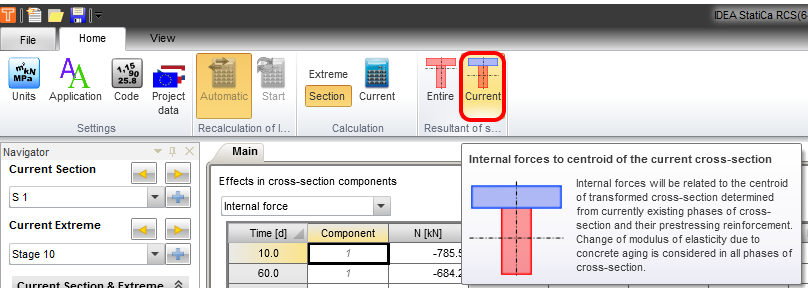 If we first enter the internal forces to the Entire section and then switch to the Current, we can see the calculation of these internal forces to the current phase of the transformed cross-section or the cross-section with a shifted center of gravity due to the prestressing tendon. The center of gravity also changes the location due to the aging of the concrete.