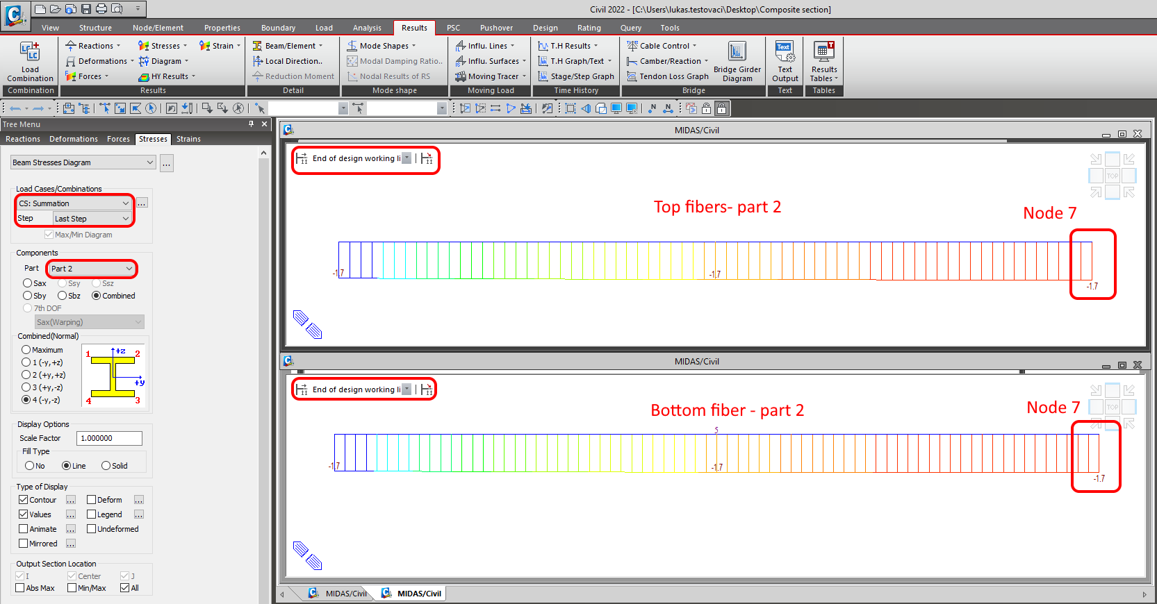 Let's check the value of linear stress in Midas Civil in element 5 and node 7.
