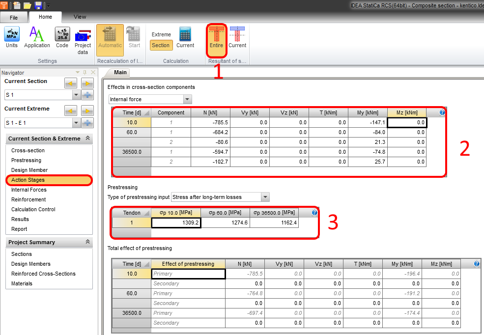 Action Stages are the most important in terms of correctly entering internal forces from third-party software such as Midas Civil. It is important to note that the internal forces from Midas Civil are related to each part of the cross-section (See the tab in chapter Midas Civil). In RCS, it is possible to enter internal forces into the Entire or Current section(1). Let's explain what each option means.