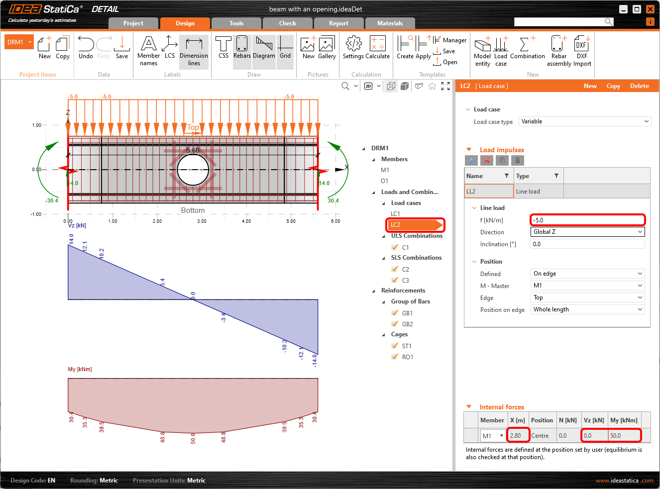 For LC1 (permanent load), change the Internal forces so that you input the values of shear force and bending moment at the point of the opening. In Load Impulses, keep the value of line load to -10 kN/m in global Z-.