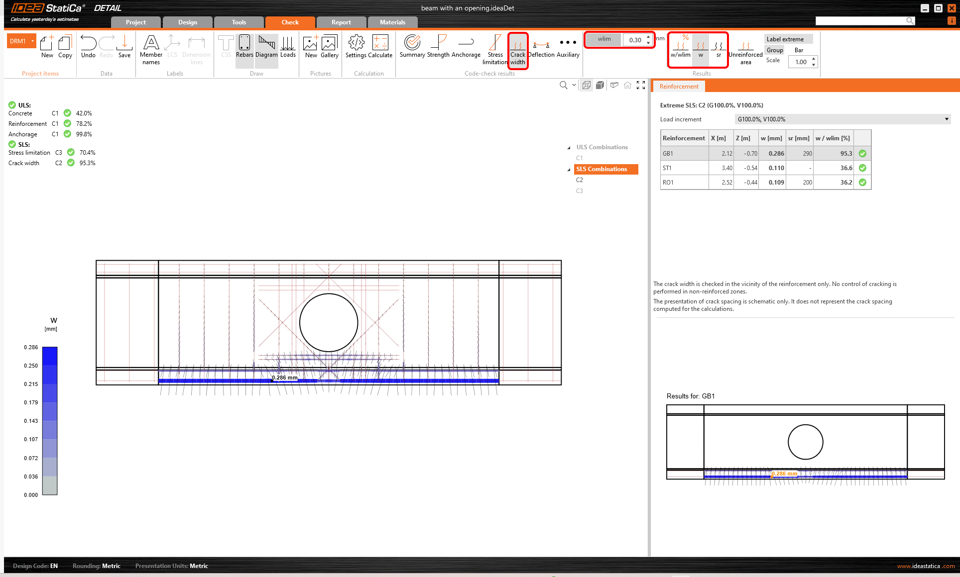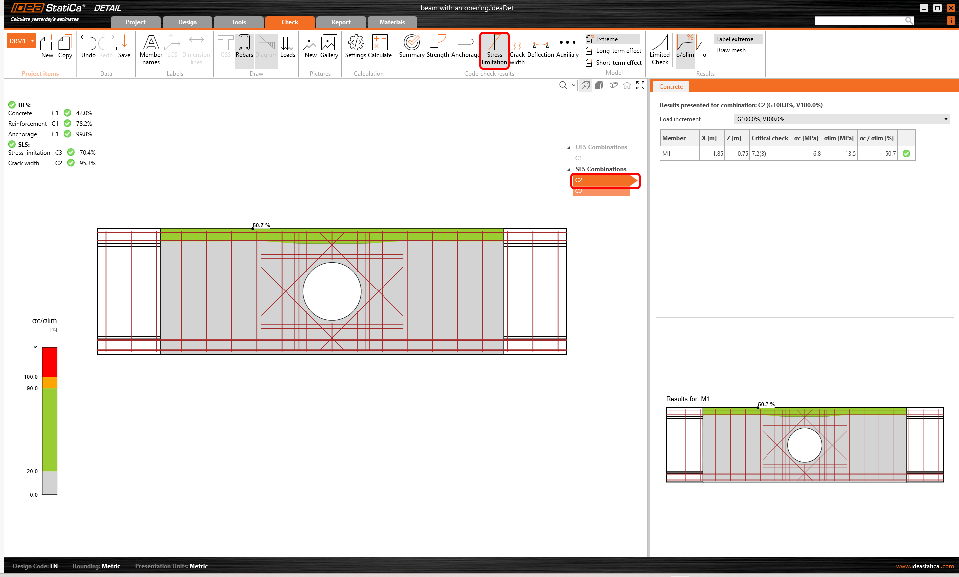 The detailed results of SLS can be found under Stress limitation, Crack width and Deflection. For the Stress limitation state, the stress in concrete is checked for both C2 and C3 combinations, while the check of reinforcement is applied only for the combination C3.