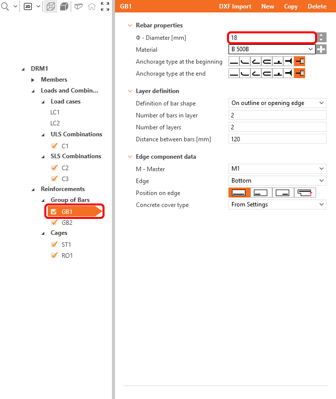 The operation GB1 includes a group of bars at the bottom face of the beam. Change the diameter of bars.