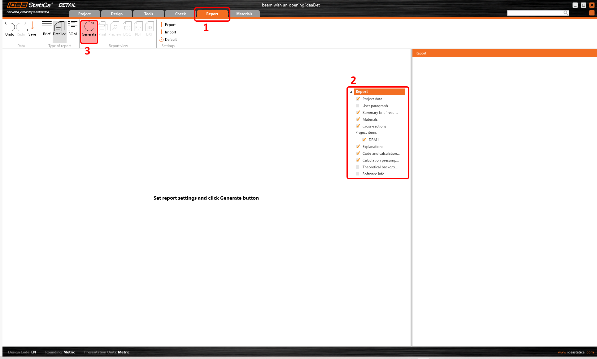 At last, go to the Report Tab. IDEA StatiCa offers a fully customizable report to print out or save in an editable format.