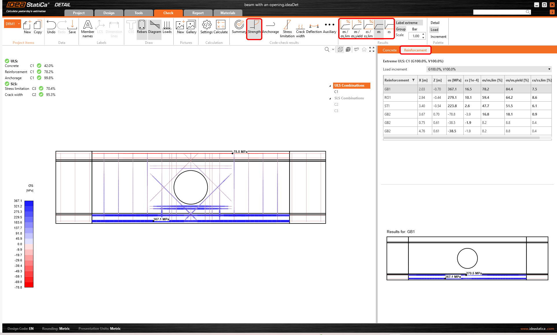 To open the detailed results of ULS, click Strength in Code-check results. As noted above the table, C1 combination was used to check ULS.