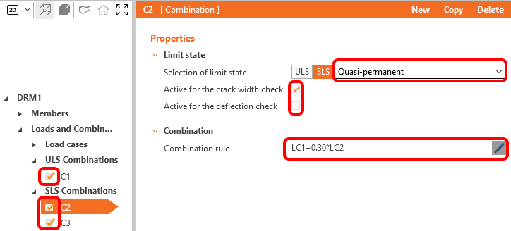 Three nonlinear combinations were already defined: C1 stands for ULS checks. C2 is a quasi-permanent and C3 a characteristic load combination, both defined for SLS code checks. You can define new combinations if required, there are three types of combinations available for SLS code checks: characteristic, frequent and quasi-permanent. You can select which checks shall be performed for each combination and the partial coefficients for the combination rules can be adjusted as well. In our case we use the predefined combinations.