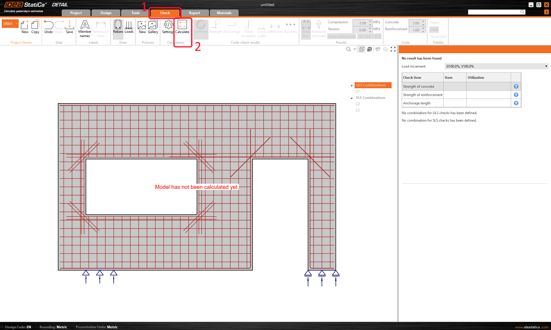 Proceed to calculate the project. Continue to Check in the navigator and press the Calculate button at the top ribbon. The analysis model is automatically generated, calculations are performed, and you can check the results.