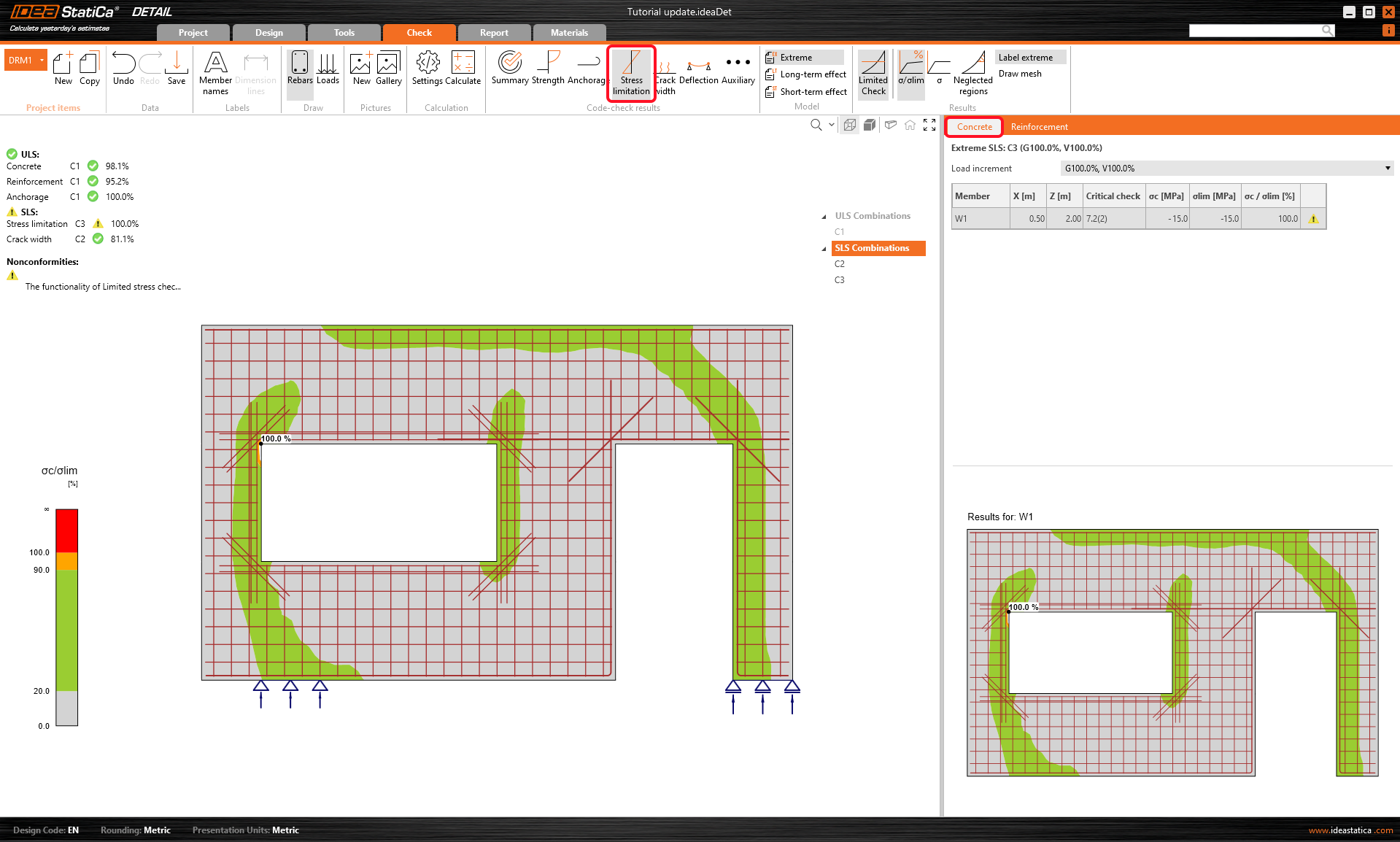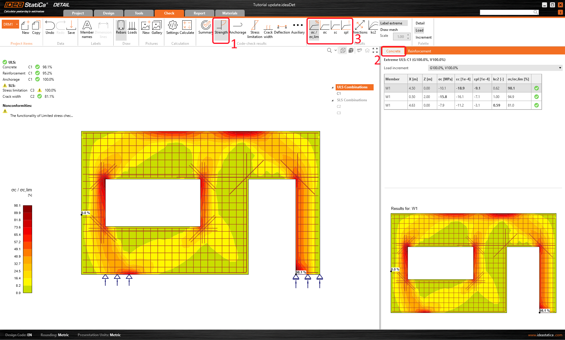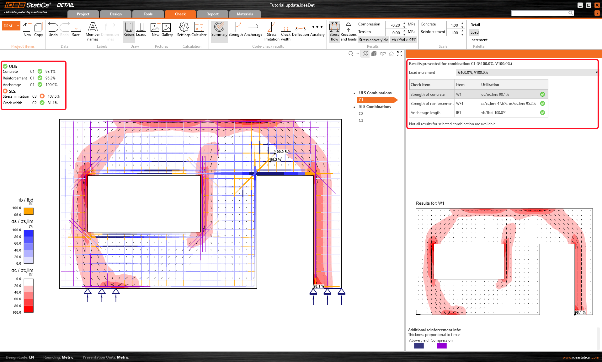 To go through the detailed checks of each component, start with click on the Strength tab. This will open concrete ULS checks such as utilization in stress, stresses in principal direction, strains, and also a map of reduction factor kc. As noted above in the table, the C1 combination was used to check ULS.