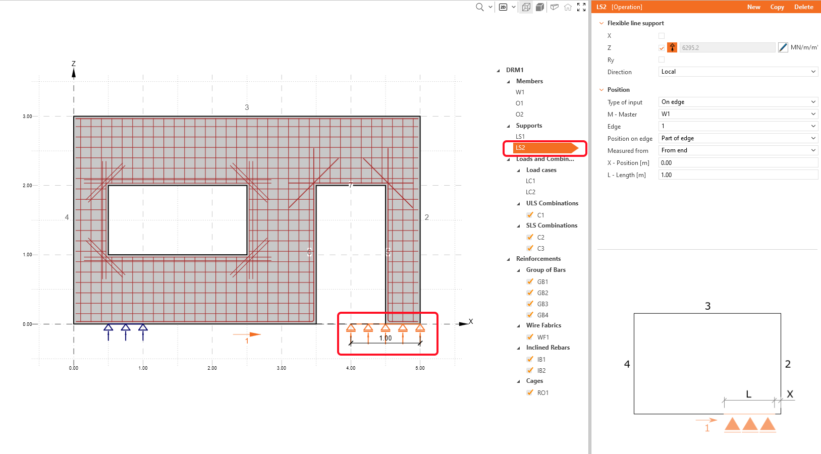 In this example, you will work with a wall supported by two linear supports. Select the third support LS3 by clicking on it in the tree of entities or by selecting the middle support in the 3D scene and then clicking on the delete icon.