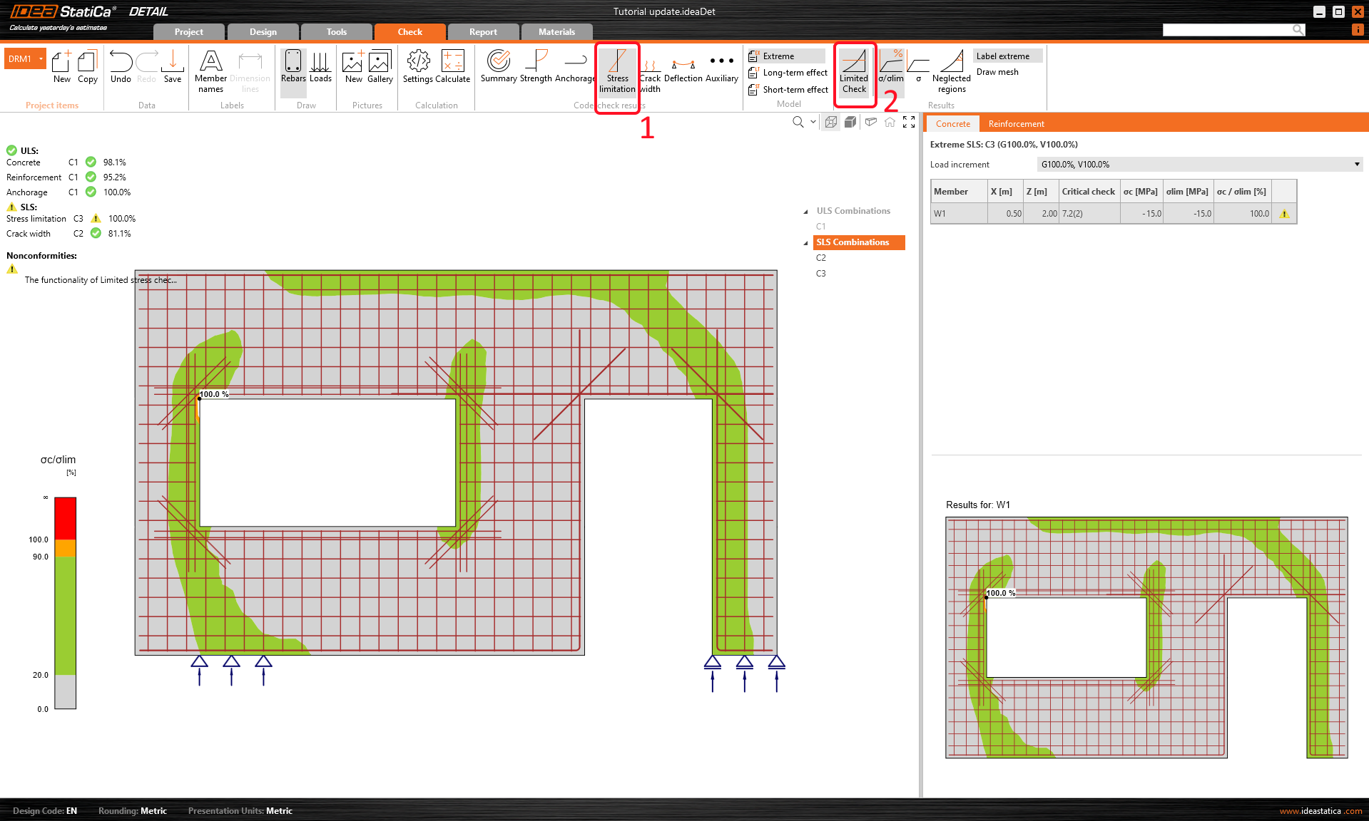 The results of SLS checks can be found in the Stress, Crack, and Deflection tab. For the Stress limitation state, the C2 combination was governing to check the concrete, while C3 to check the reinforcement.