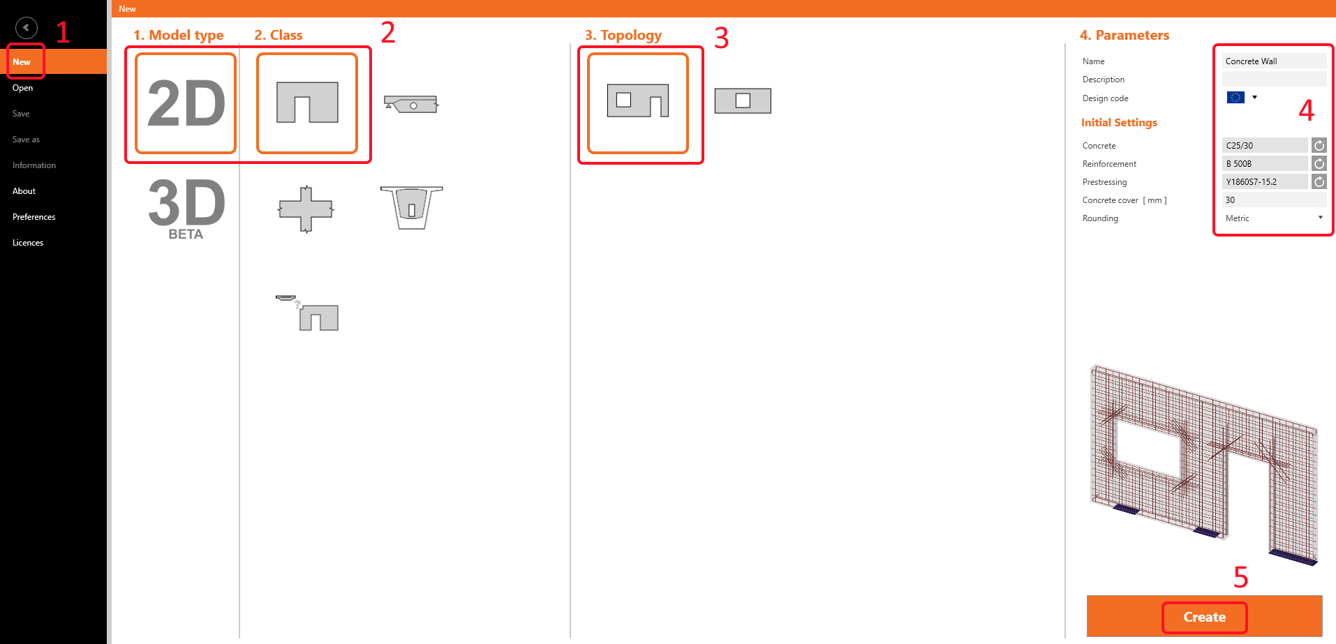 In the Discontinuity Region Wizard, select the 2D model type and tehn the Wall template. Select the topology of the discontinuity region – Wall with window and door openings. Finally, set the properties according to the picture (Concrete - C25/30, Cover - 30mm).