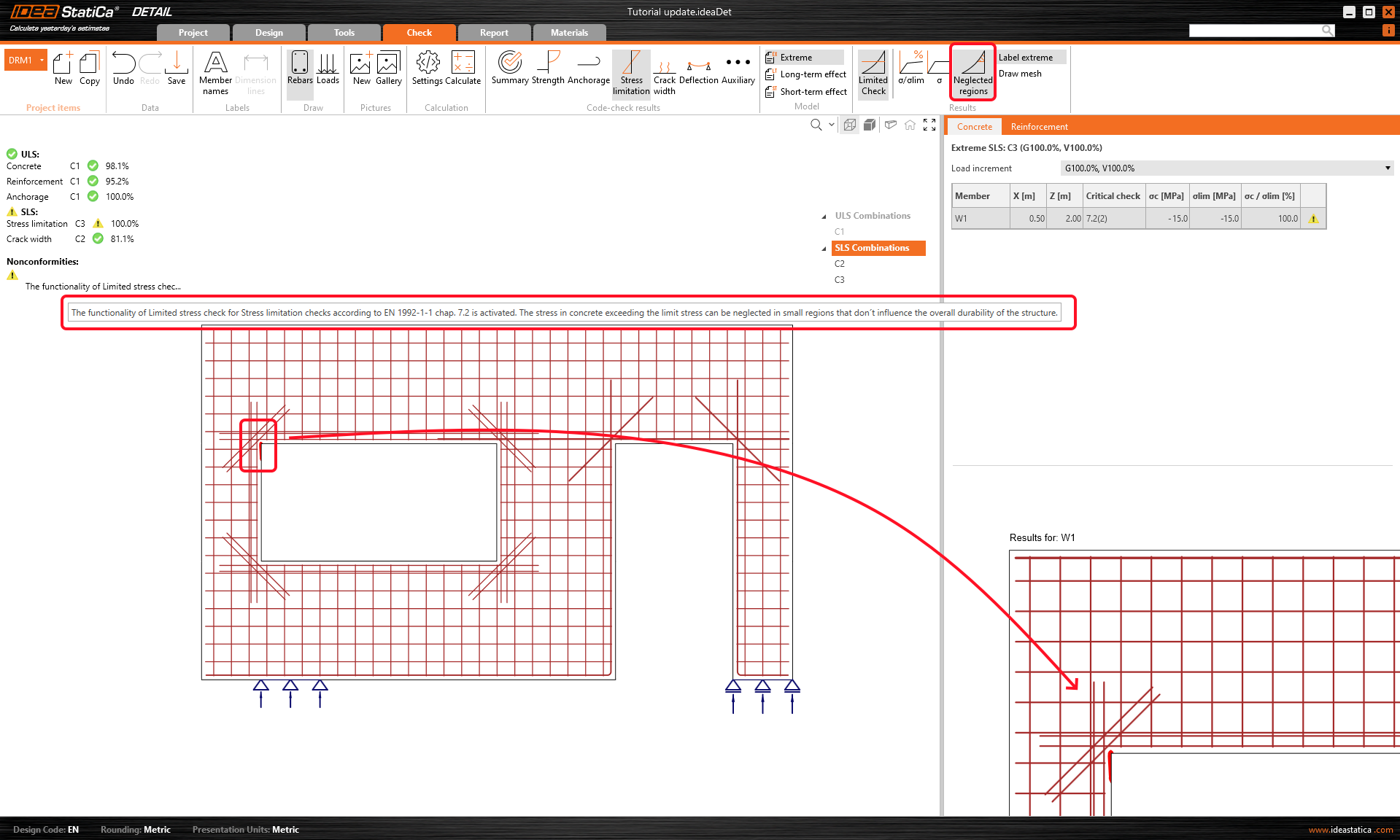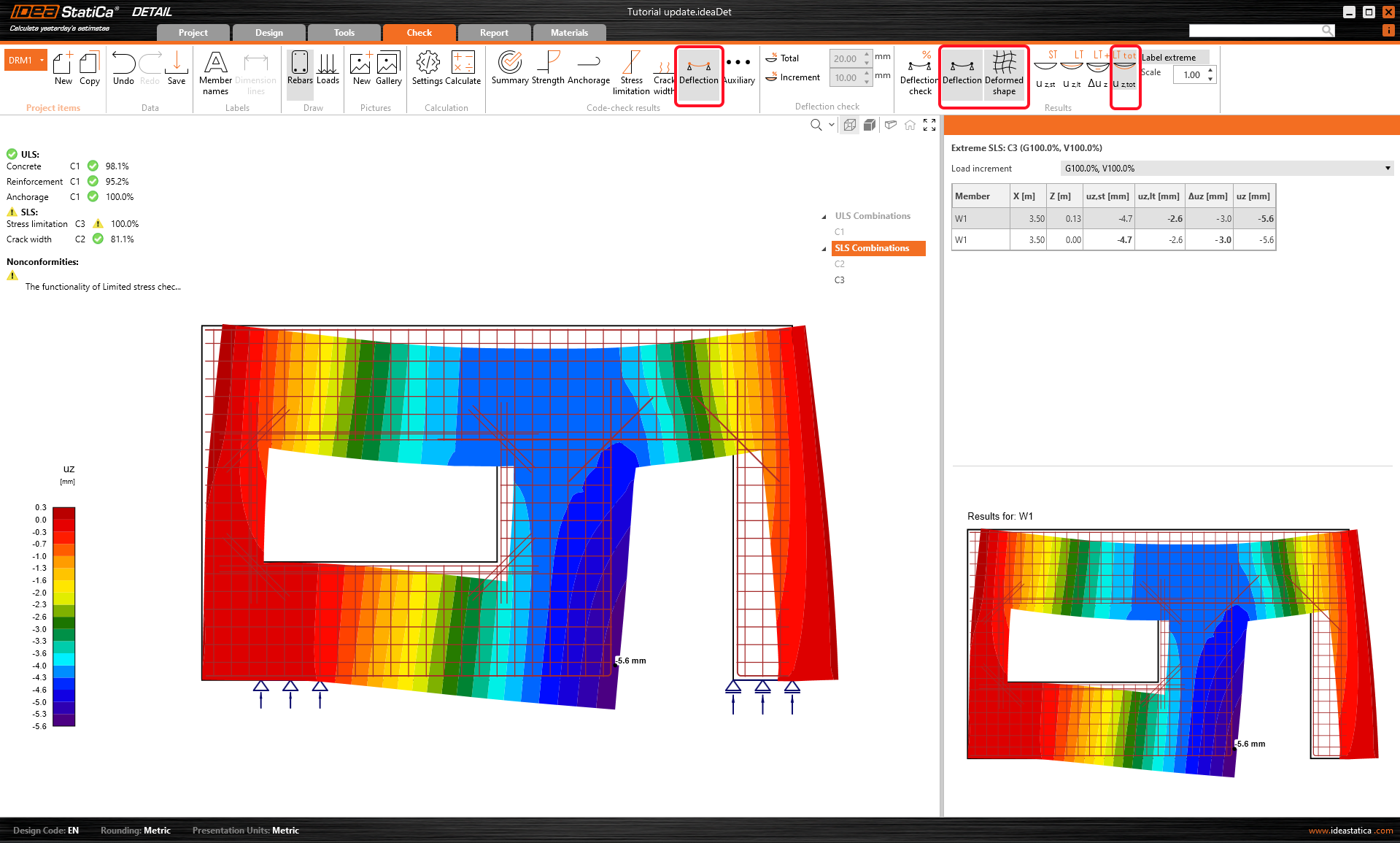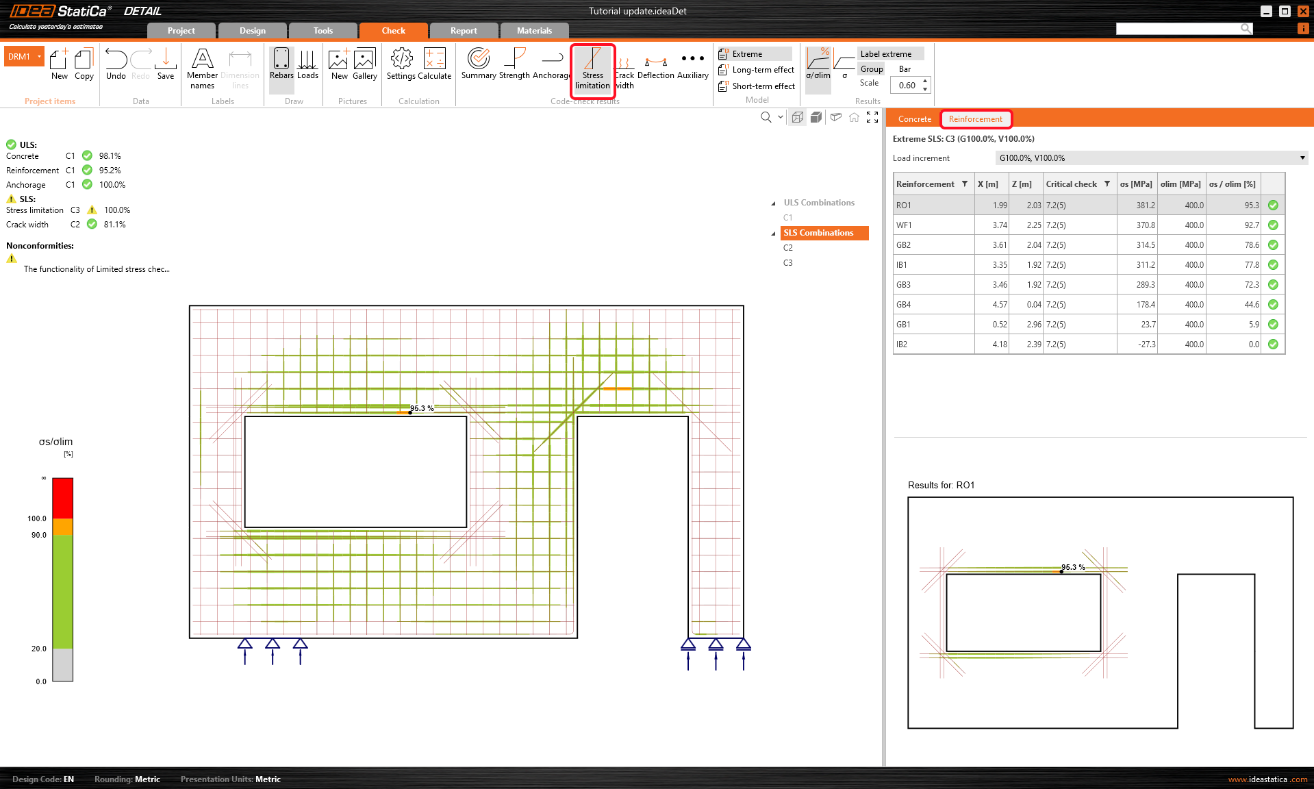 By changing the rows, you can display all the code checks. In the Summary, the main results for ULS/SLS are presented. As you can see from the picture SLS check isn't OK - stress limitation unsatisfied.