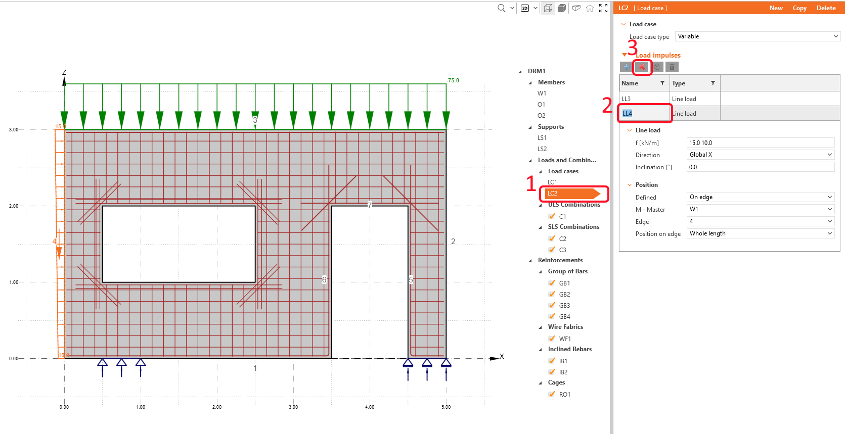 The load case LC1 (permanent) contains two line loads in Load impulses: uniform vertical load LL1 on the top edge 3 and linear horizontal load LL2 on the left edge 4.