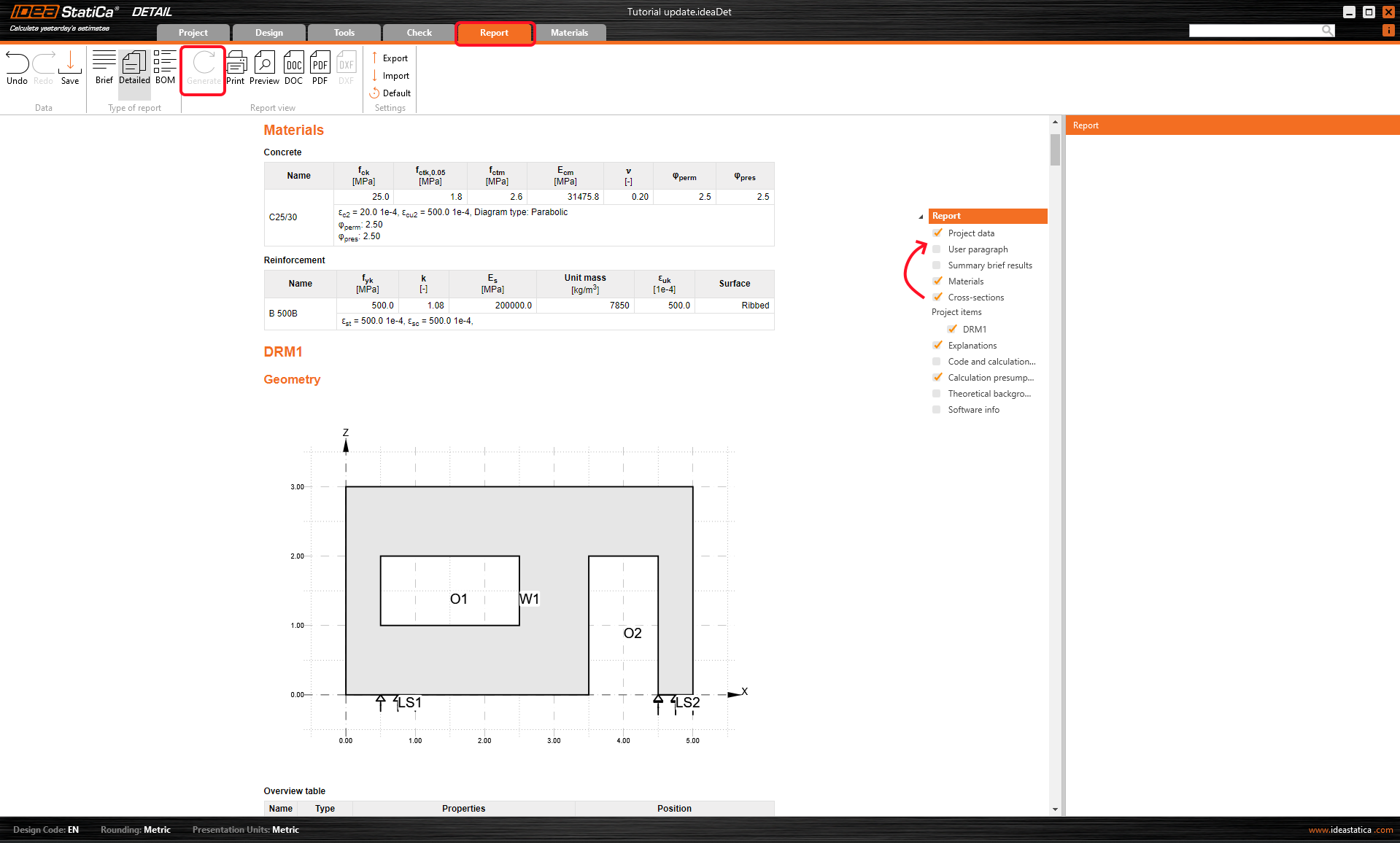At last, go to the Report Preview/Print. IDEA StatiCa offers a fully customizable report to print out or save in an editable format. By dragging the lines in the tree of entities, you can reorganize the structure of your report.