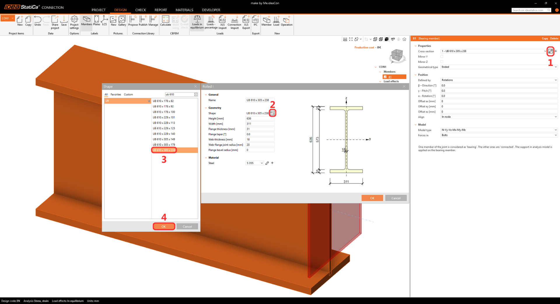 After creating a blank design, change the Cross-section of a member to UB 610 x 305 x 238.