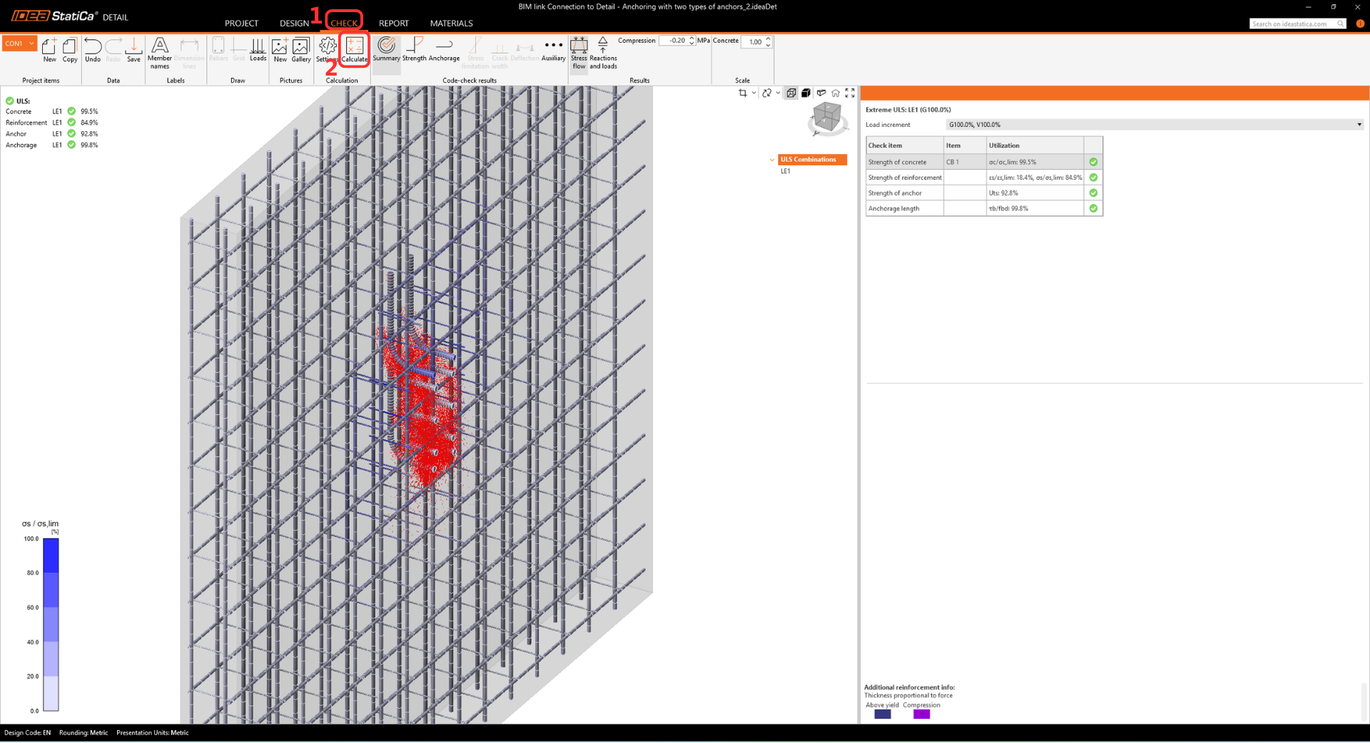 Switch to card, Check -> Calculate. The code check proves the failure mode on the anchors. By default, the concrete block is assumed to be cracked.