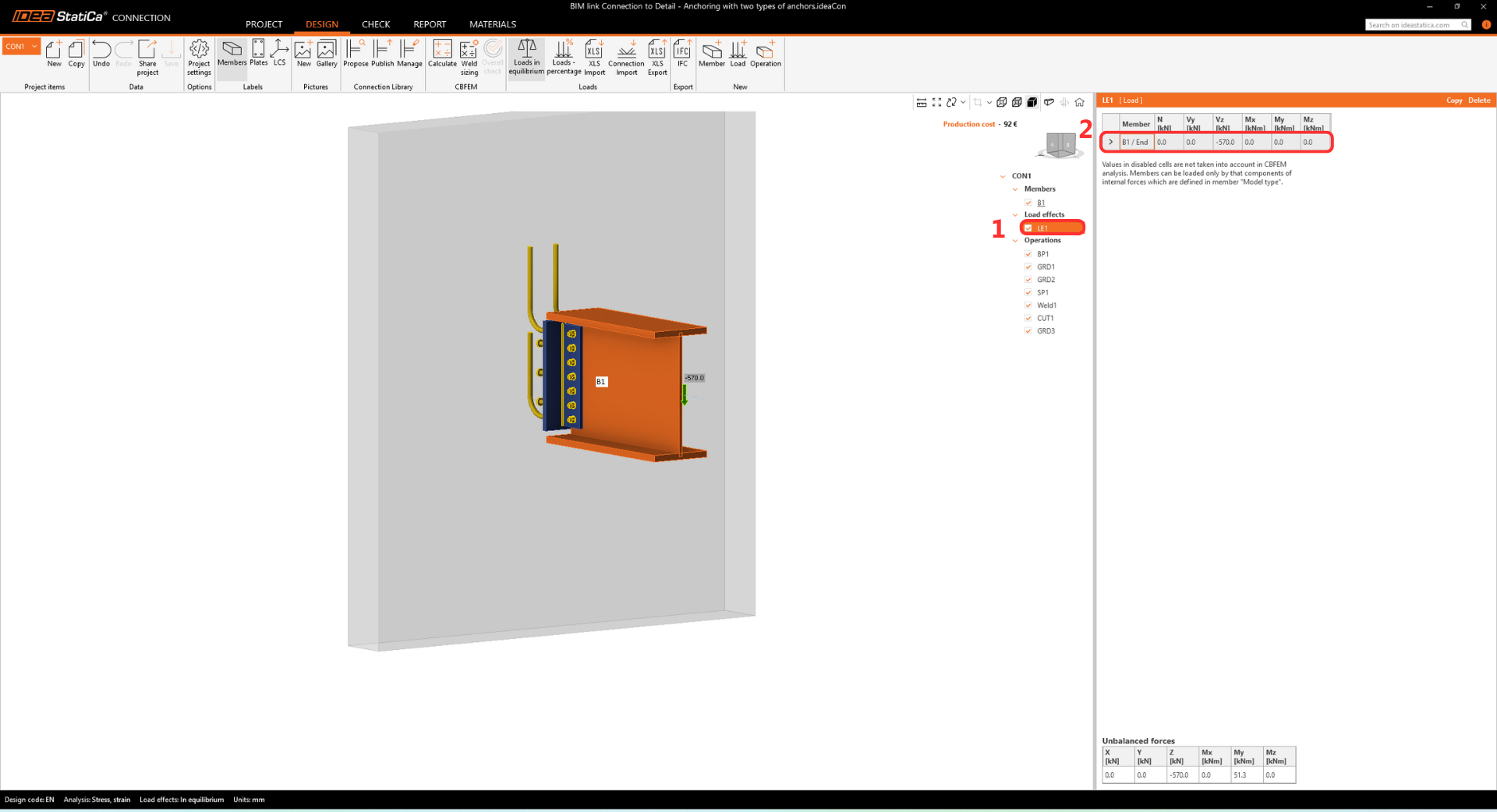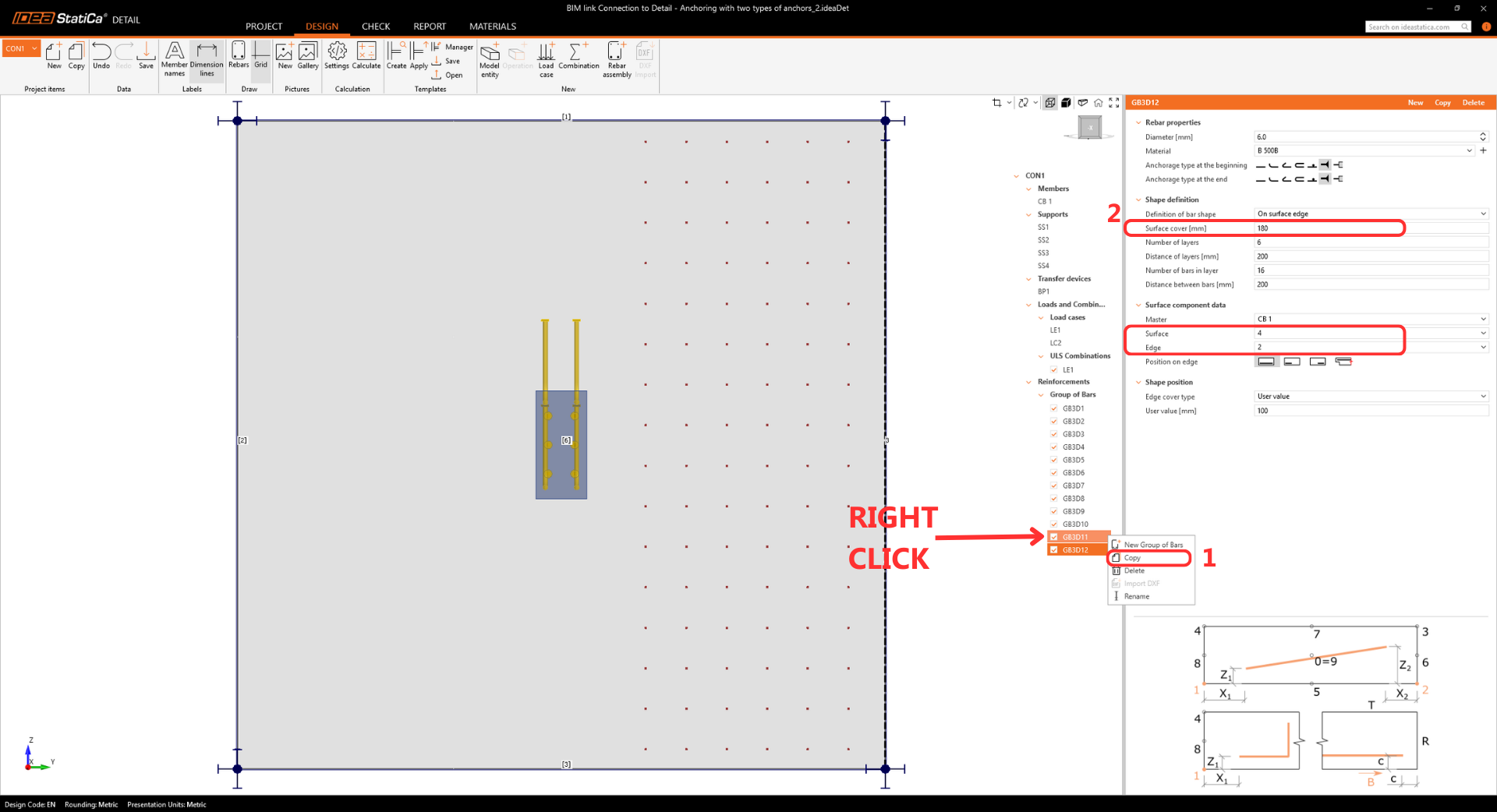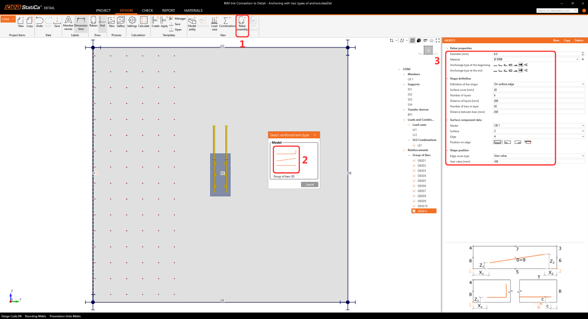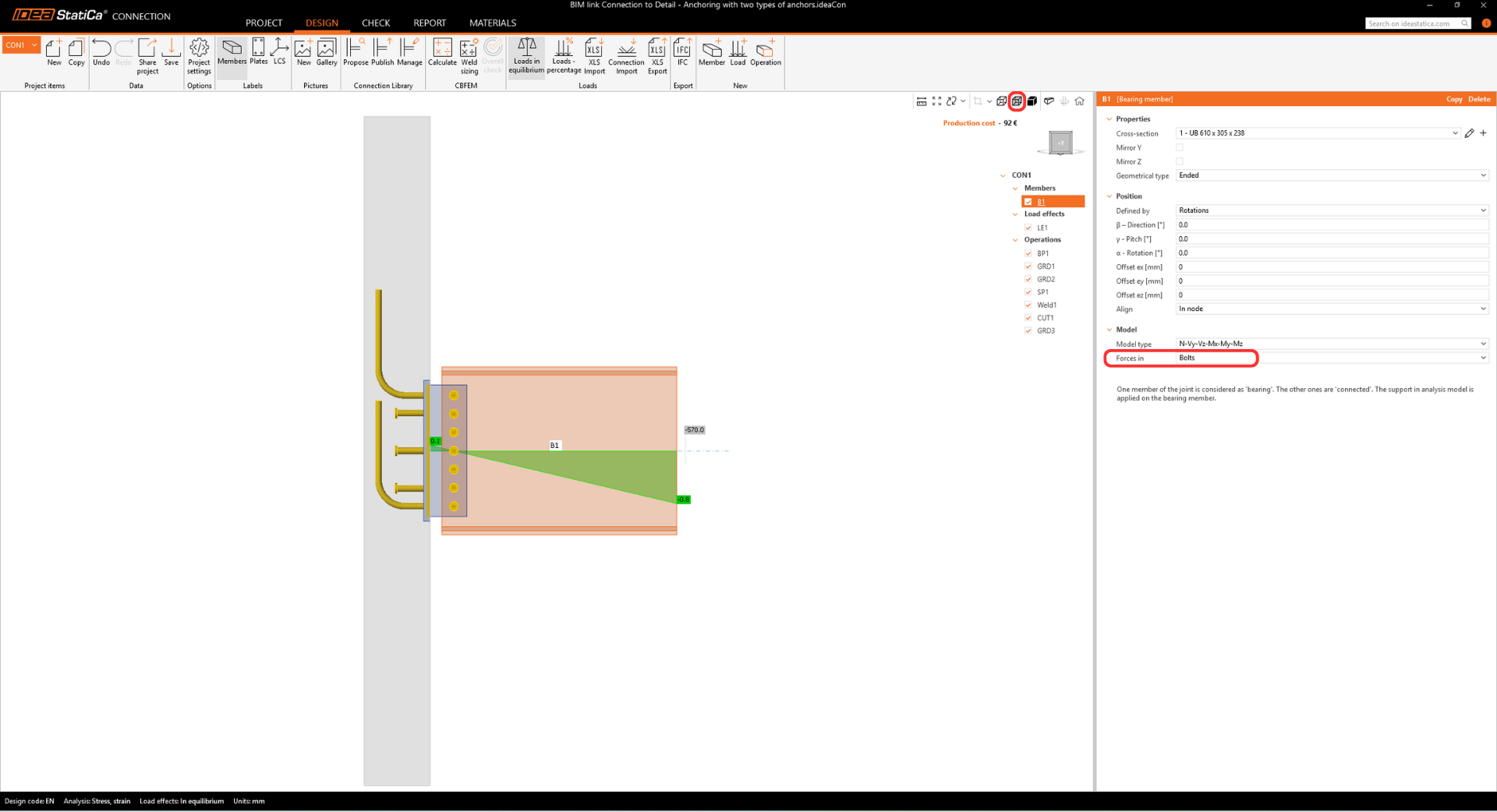 The anchors are imported from IDEA StatiCa Connection. Since the design uses two different anchor types, we will separate the load transfer to ensure a safe and predictable behavior. This approach aligns with standard UK engineering practice to resolve the limitation of EN 1992-4 (Cl. 1.2(4)), which excludes mixed anchor groups from the standard scope. By assigning shear and tension to specific anchor groups, we create a verified load path compliant with safety requirements.